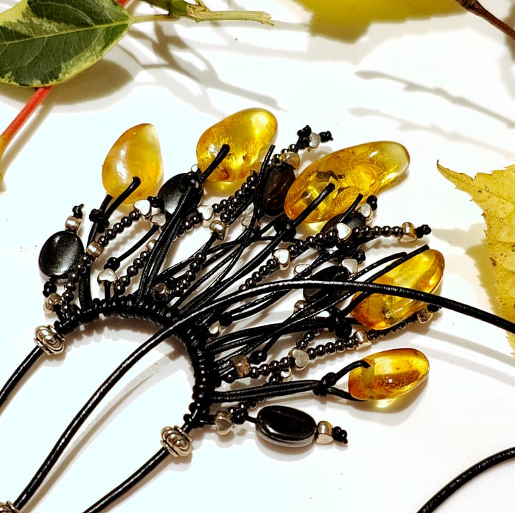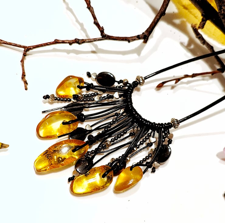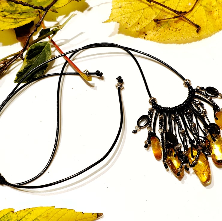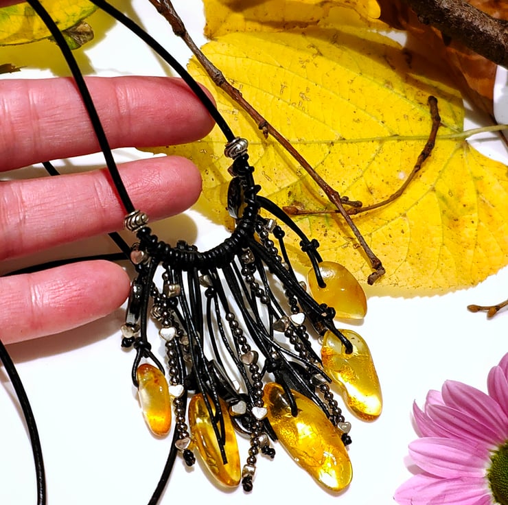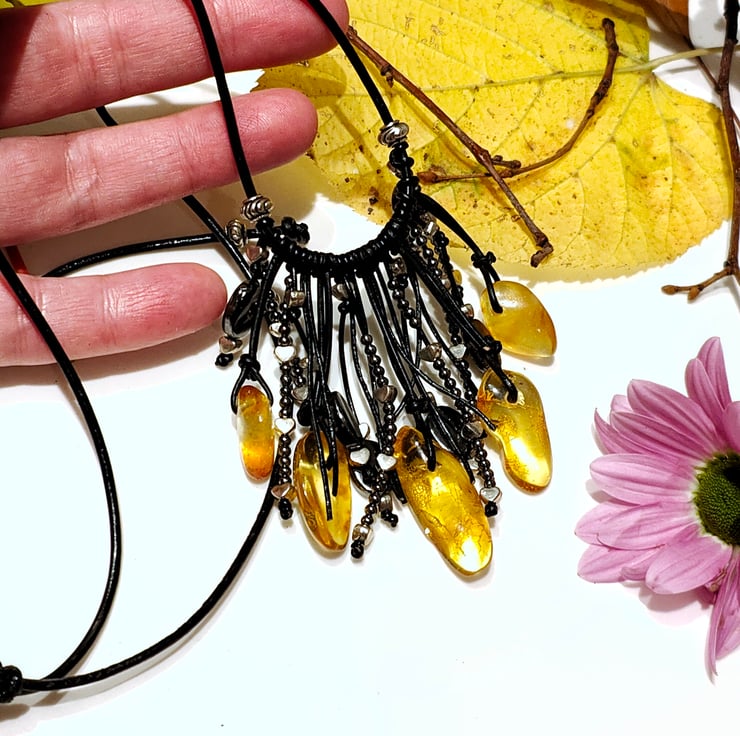 This shining necklace made of natural amber and genuine leather, plays with rays, both in the sun and in artificial lighting.