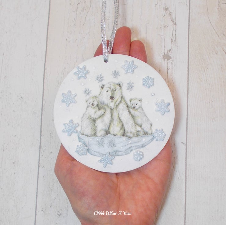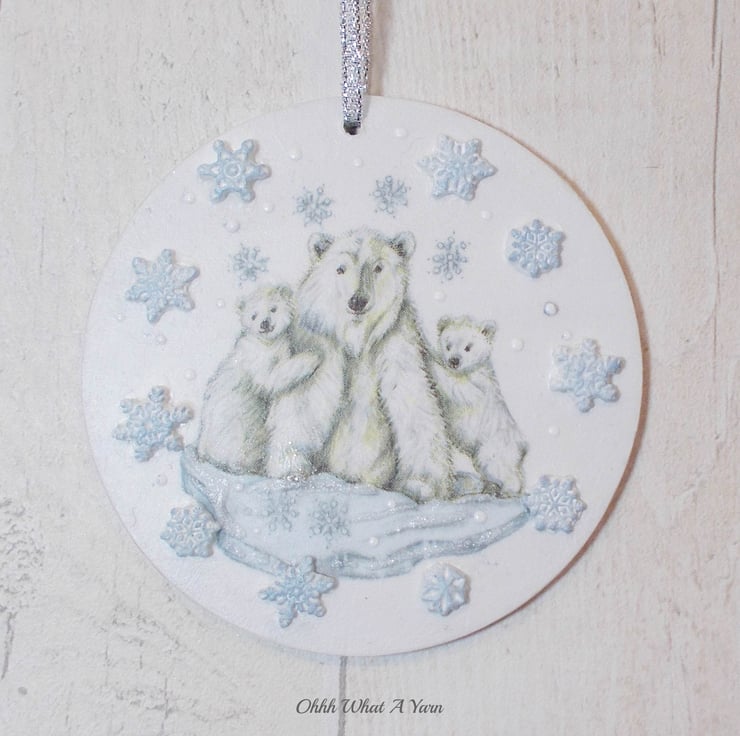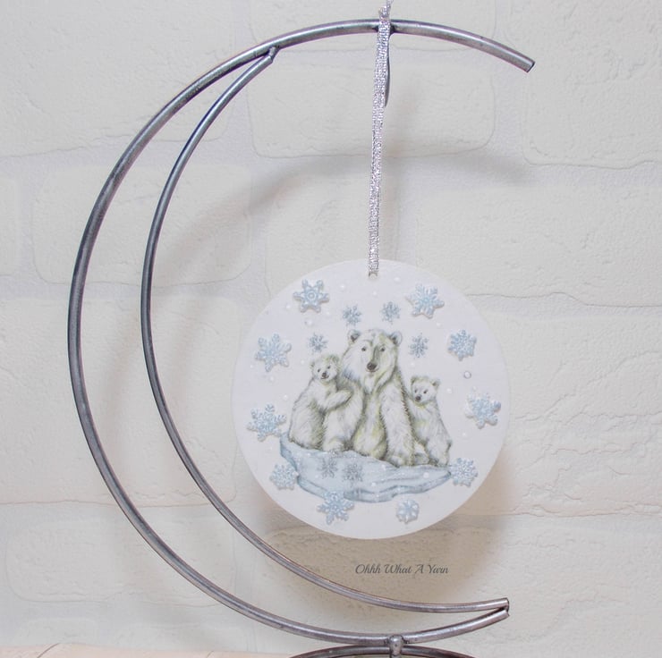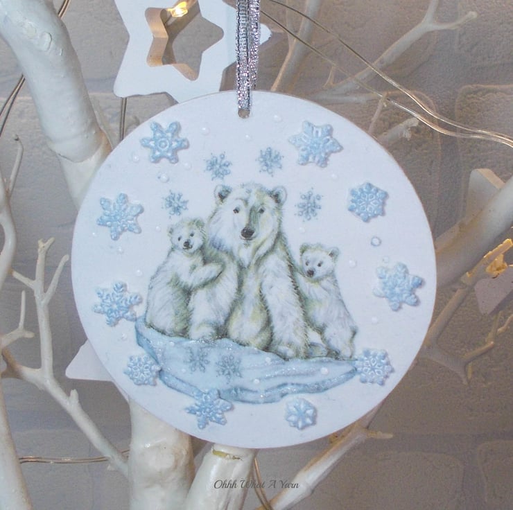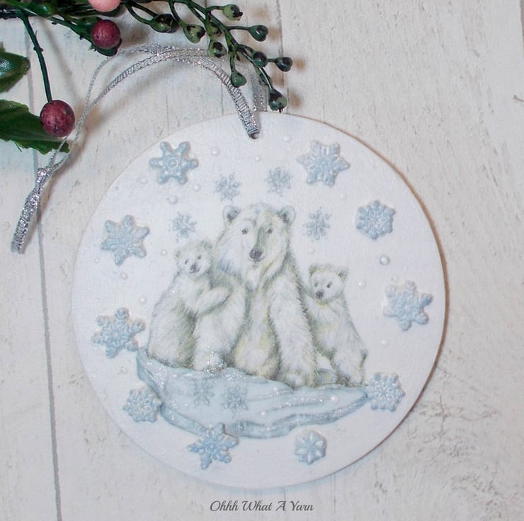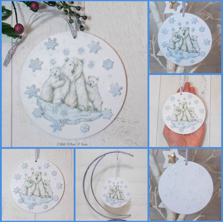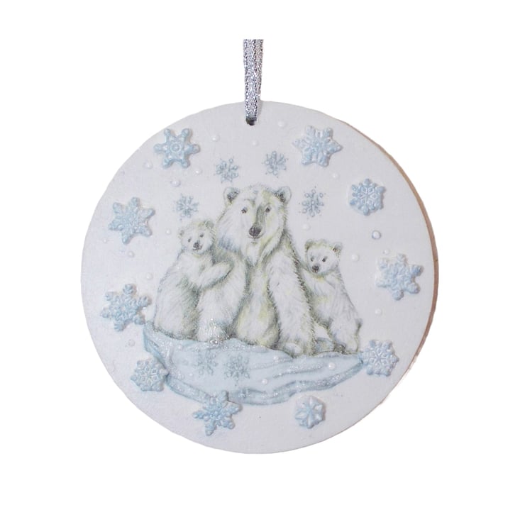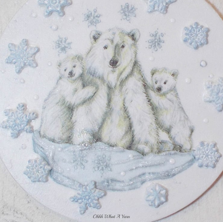 This pretty winter polar bear decoration has been created on a 10cm MDF circle.