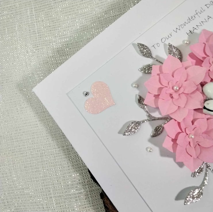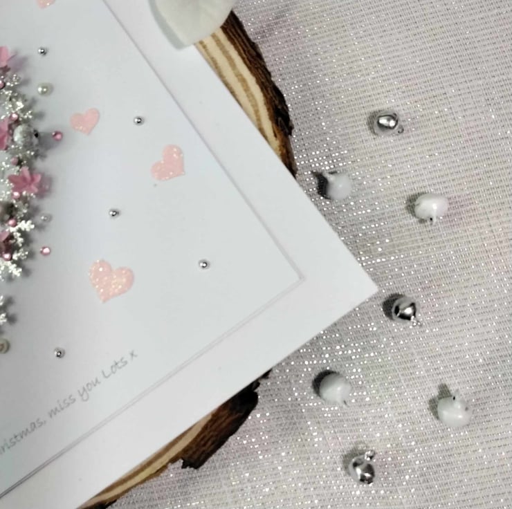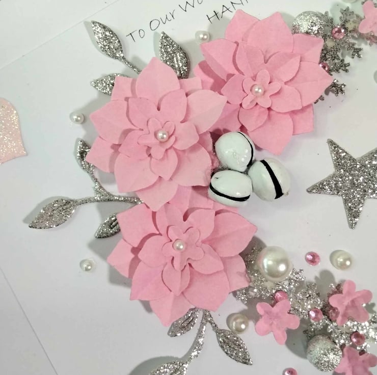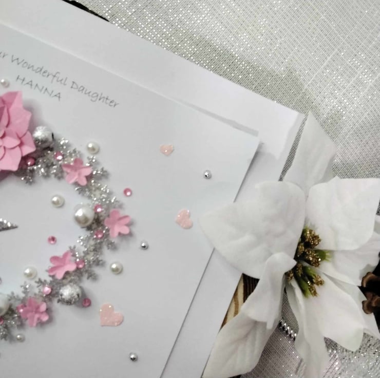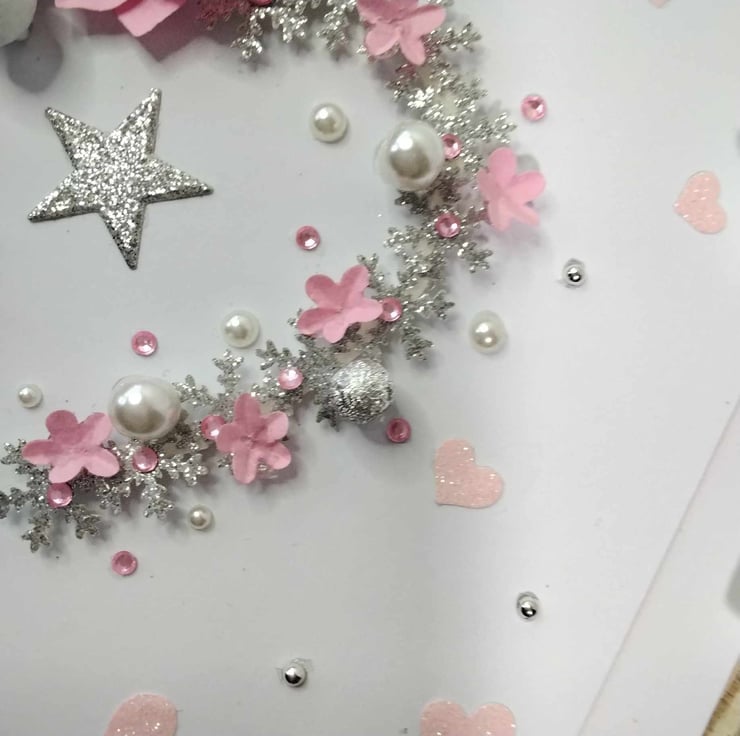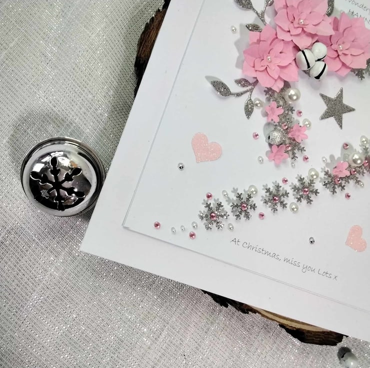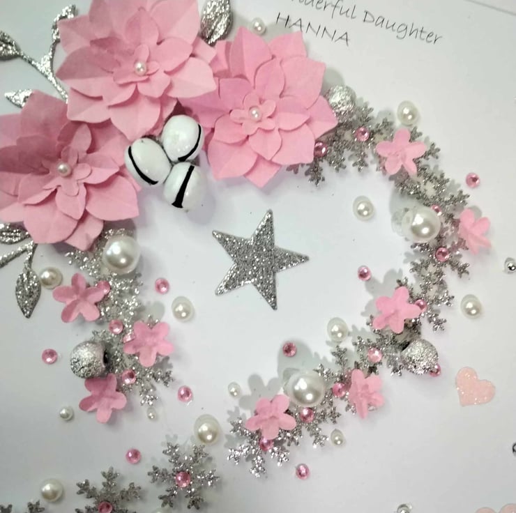 Hand-made, personalized, luxury, unique, Christmas card. A 8" x 8" square card, 300gsm card base, with presentation box. This card features hand-made pastel pink , paper flowers, silver glitter snowflakes in a cascading heart design, embellished with high quality gems and pearls, petite white bells. Personalize this card to your recipient, with a message of choice, or it will be sent blank, for your own hand written message, please contact me to discuss this, please check spelling and punctuation, many thanks Karen