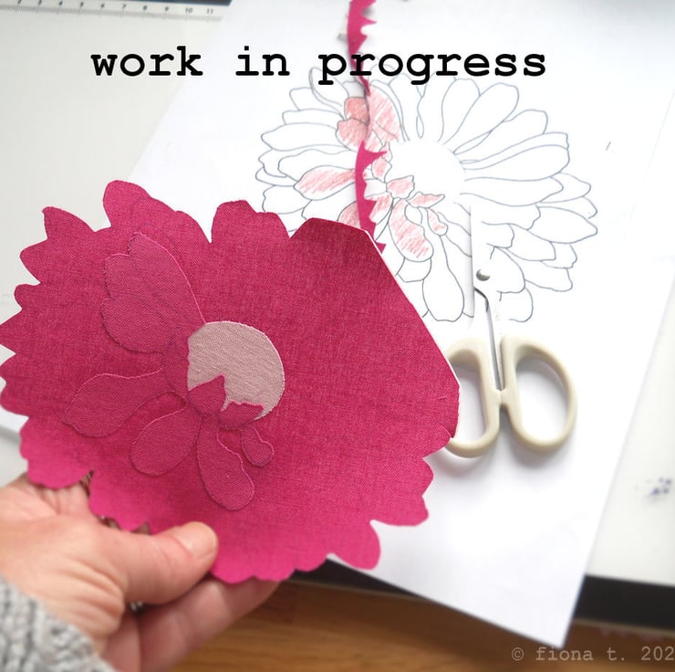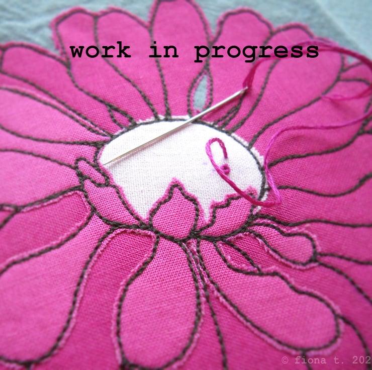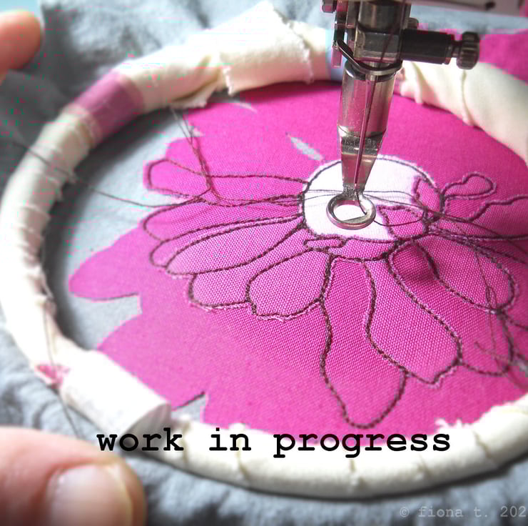 translated from my original pencil sketch, this flower is free hand embroidered in bright pinks on to hand dyed grey cotton calico.