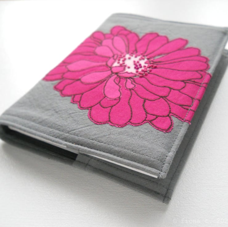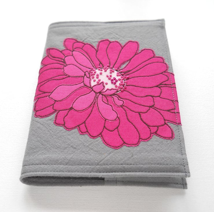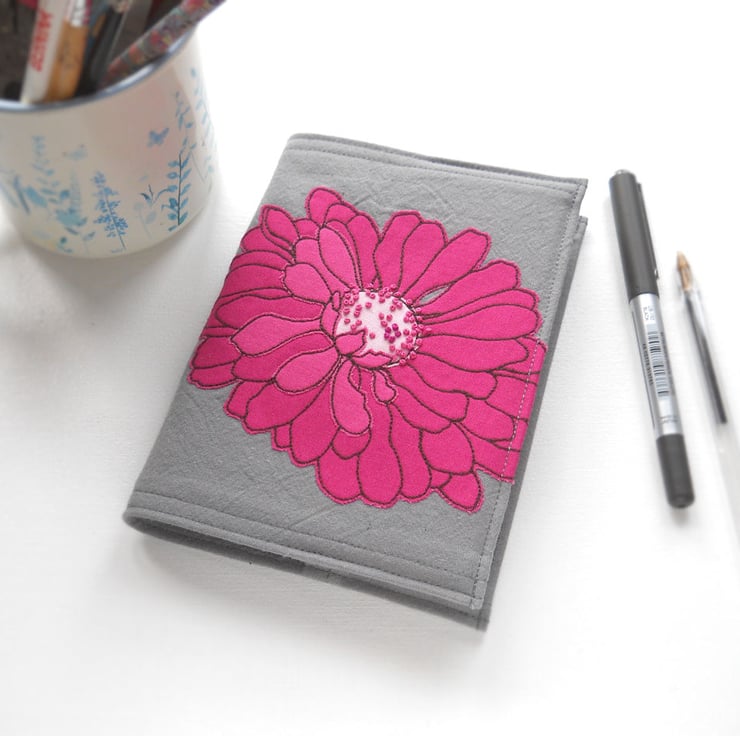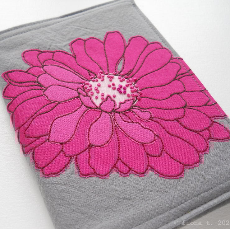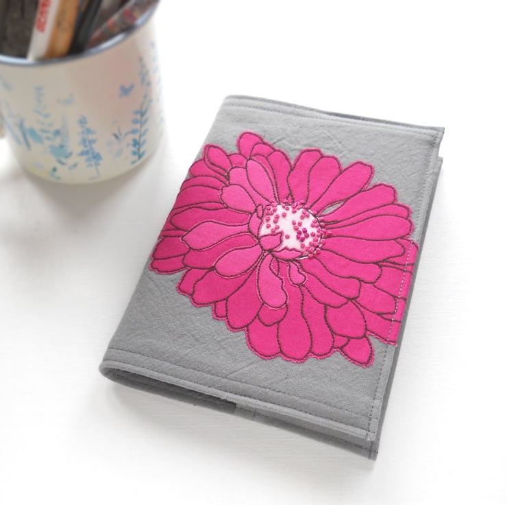 free motion and hand embroidered A6 notebook cover with sketchbook inside – hot pink & pomegranate