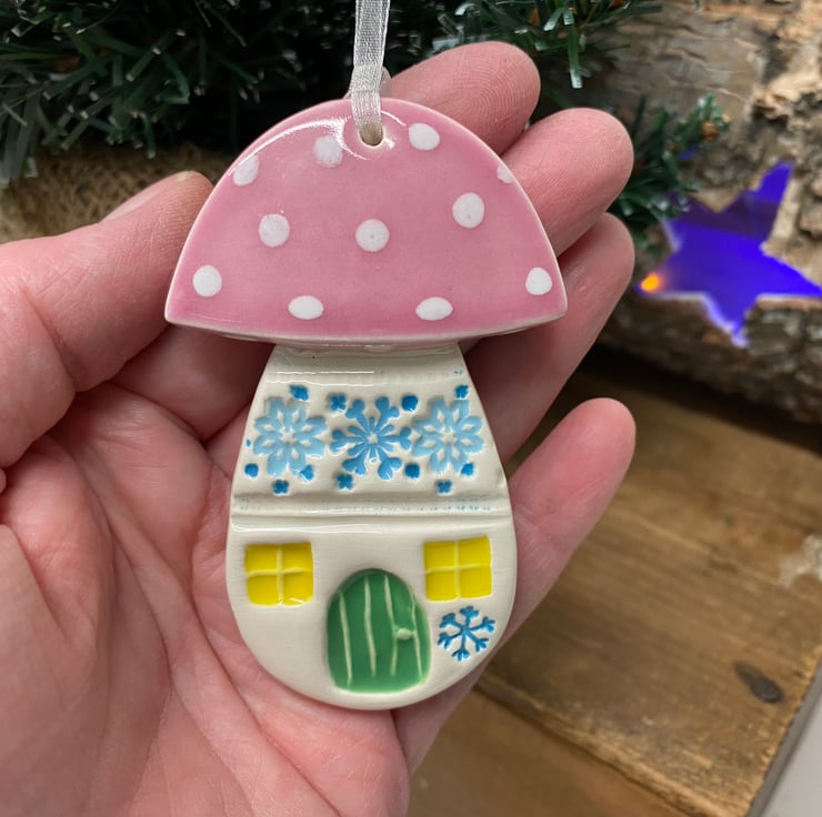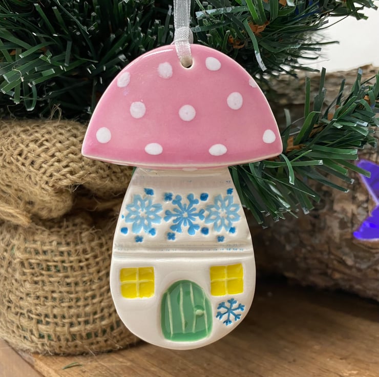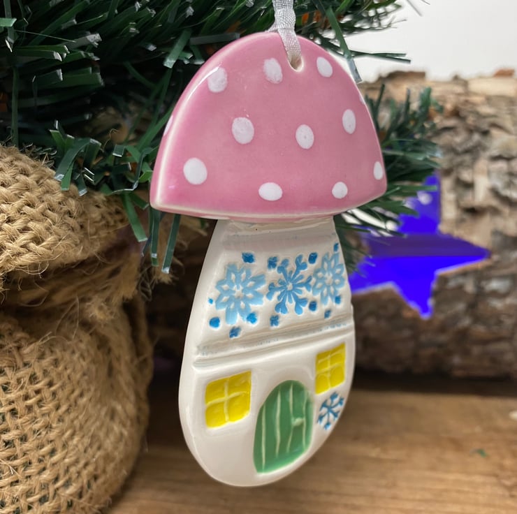 This little toadstool house decoration is made from white earthenware clay and finished with bold pattern and colour. It has been fired twice and finished with a glossy glaze for a lovely smooth finish. It measures 7cm x 5cm and hangs from a cream ribbon.