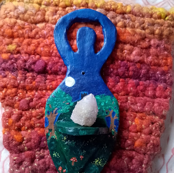 Handmade ceramic goddess symbol shape painted with Glastonbury tor surrounded by trees, flowers and mini mushrooms in a dark blue moonlit sky.