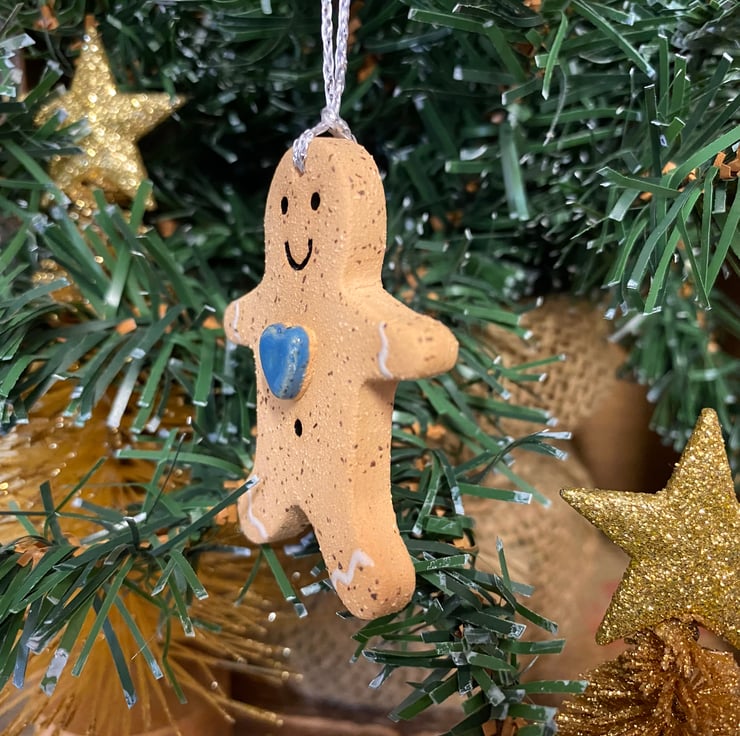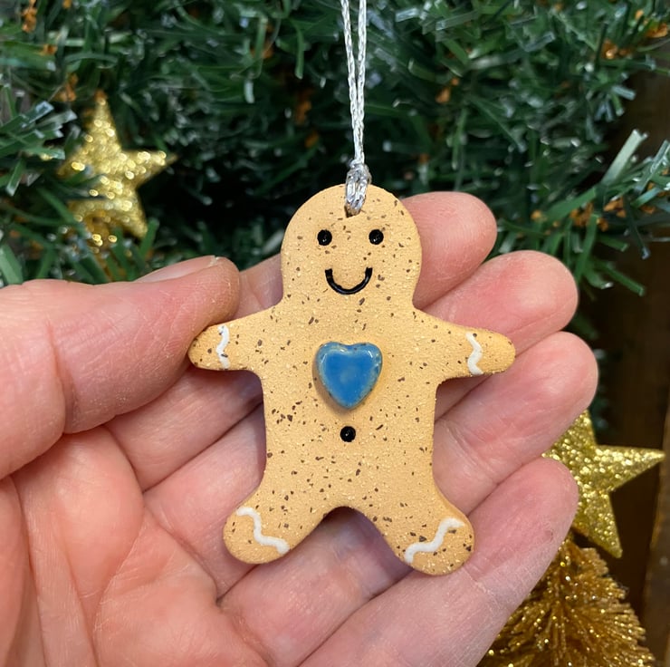 This ceramic gingerbread man is made from speckled clay, so he looks just like a biscuit! This one has a little blue heart. It's really cheerful! It measures 5.5cm length and 4.5cm width and 0.5cm deep and hangs from a glittery string.