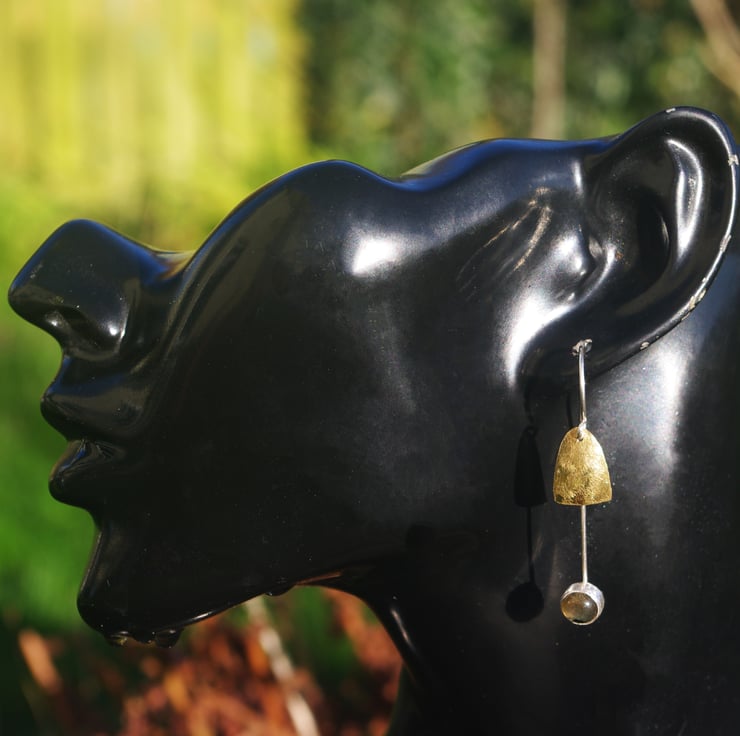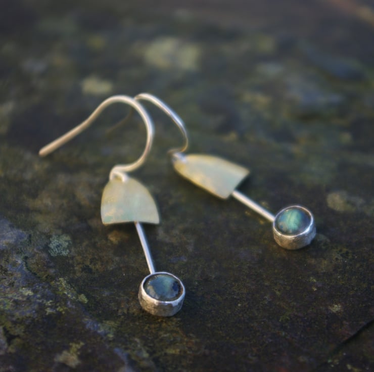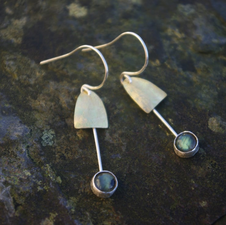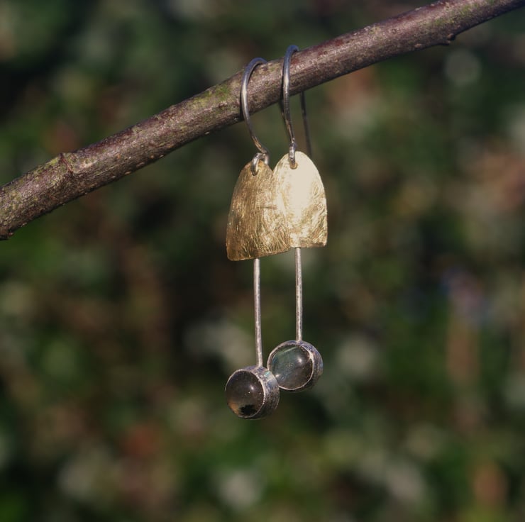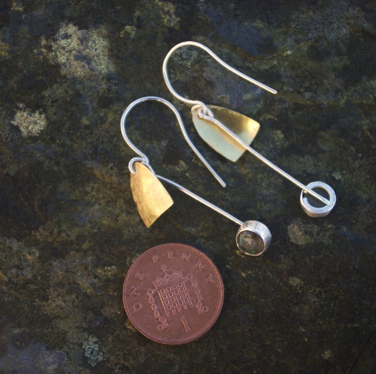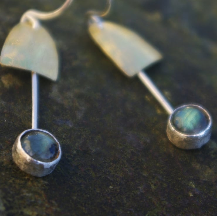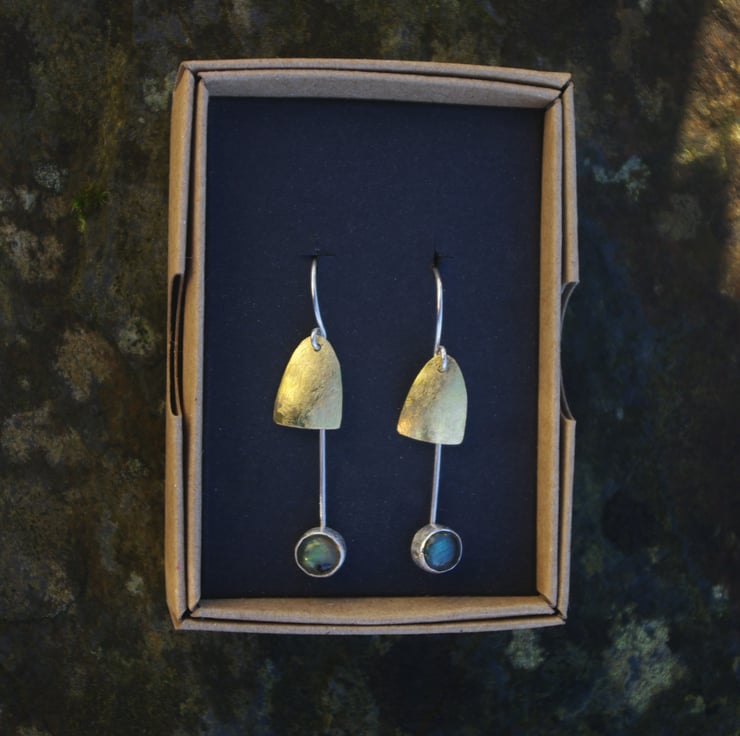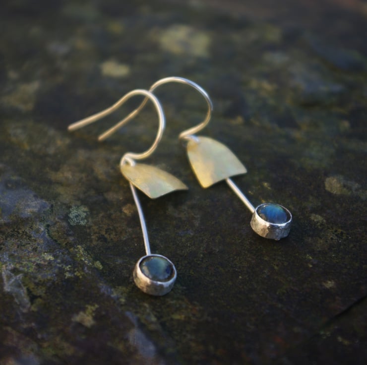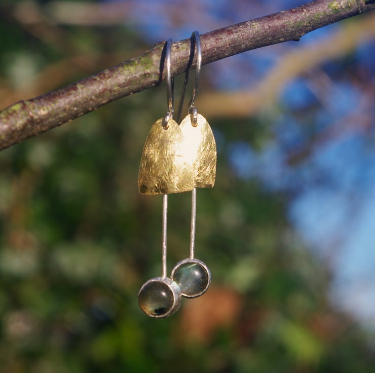 The slightly curved brass pieces are separate from the dangles, so that both pieces move about freely to catch the light. I have set the Labradorite gems in silver and attached these to a small length of silver wire. This is soldered closed where it joins the ear hook.