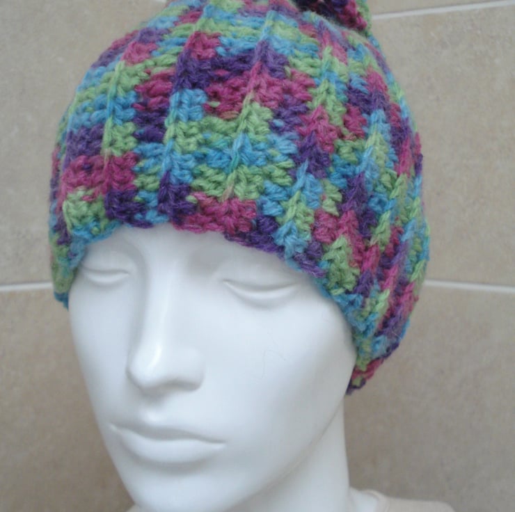 This is a hand crochet hat made with acrylic and wool multi coloured yarn. It has wiggly crochet strands on top instead of a pom pom. Would fit and adult head.