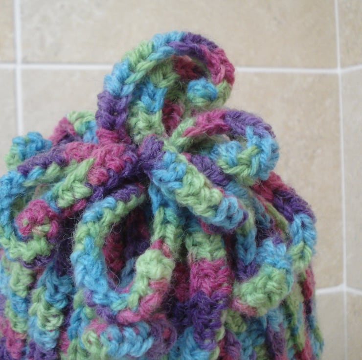 This is a hand crochet hat made with acrylic and wool multi coloured yarn. It has wiggly crochet strands on top instead of a pom pom. Would fit and adult head.