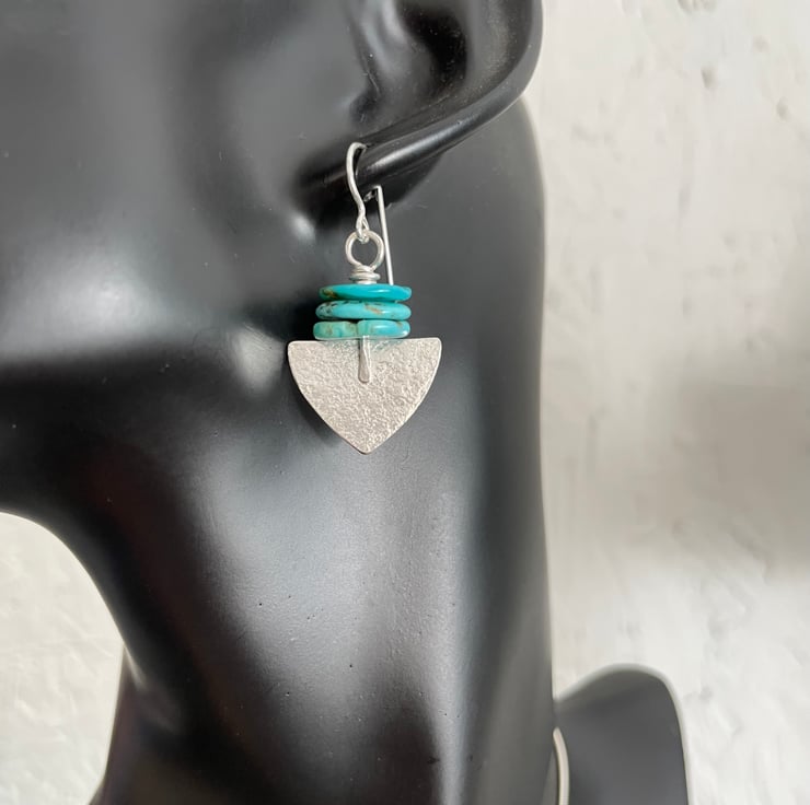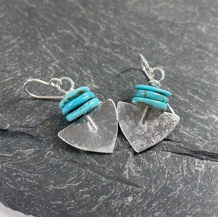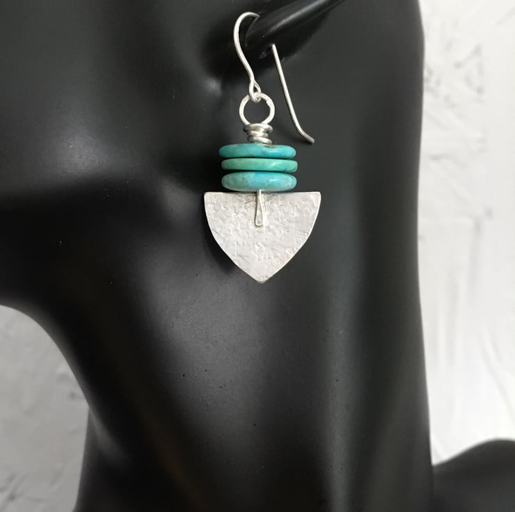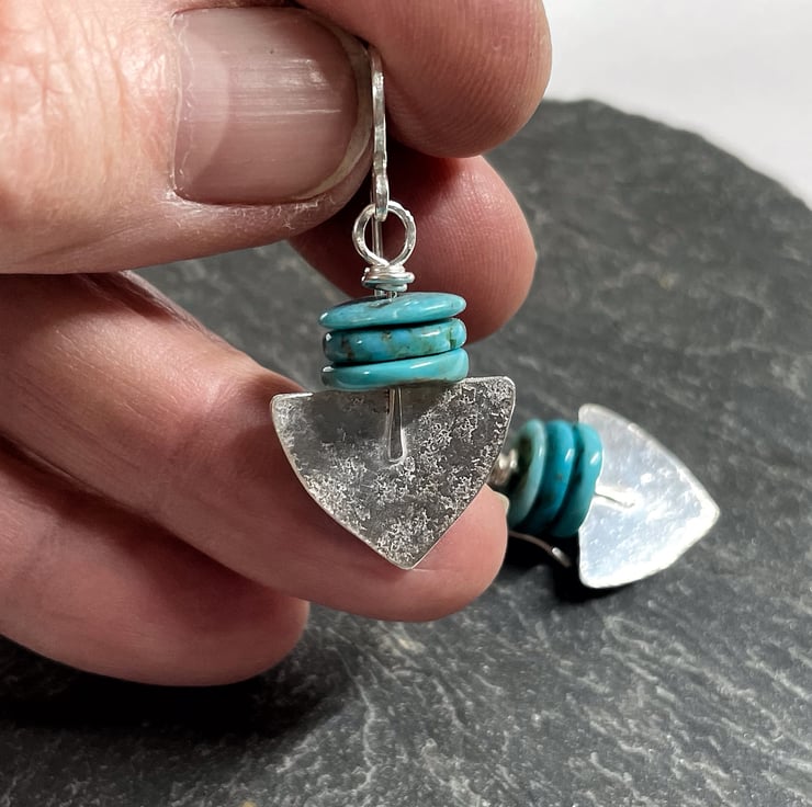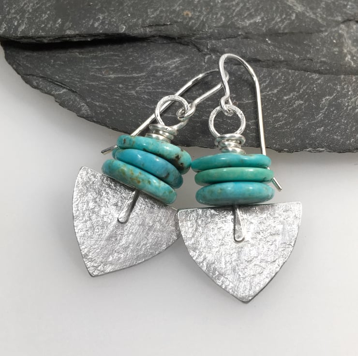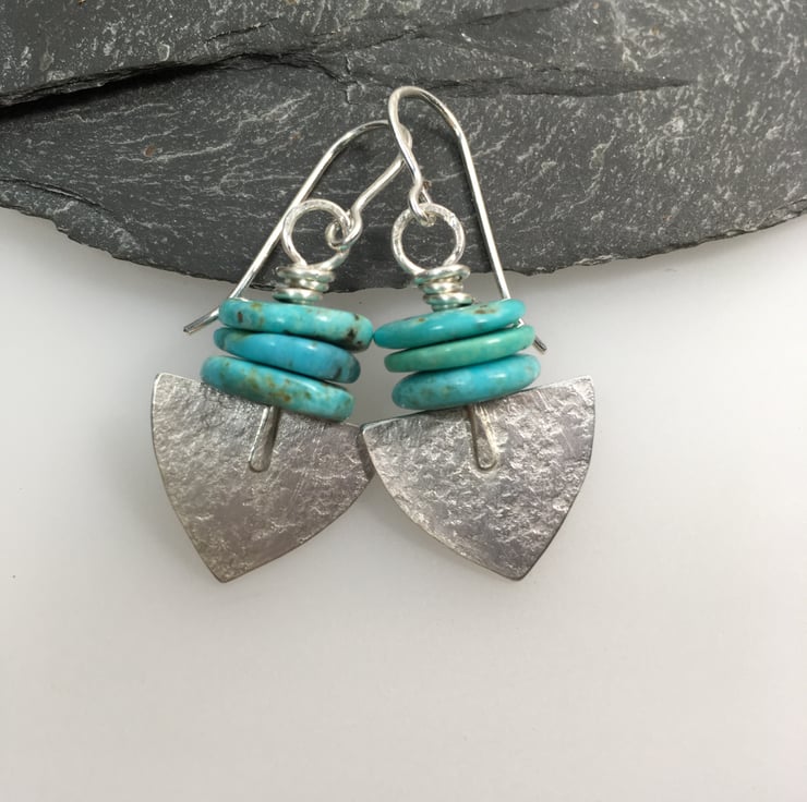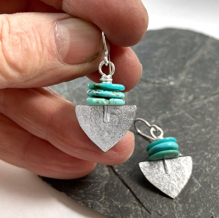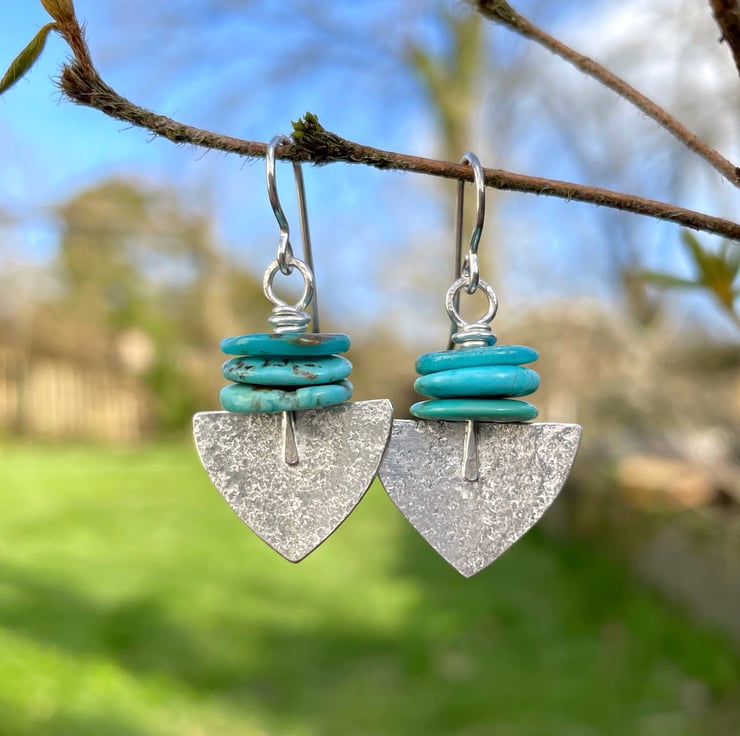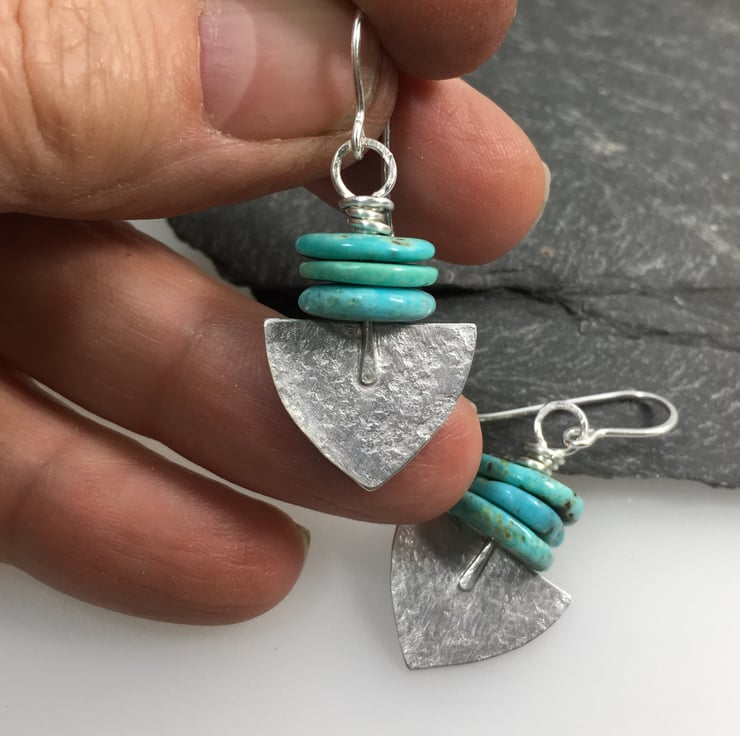 Sterling silver shovel shapes have been cut and beaten for texture, they have been topped with a trio of turquoise disc beads.