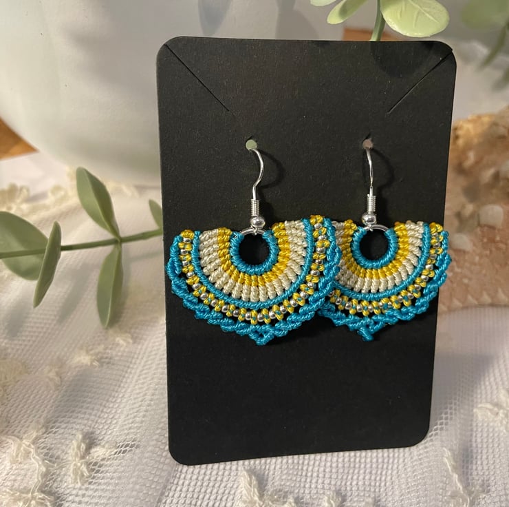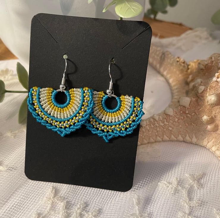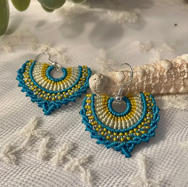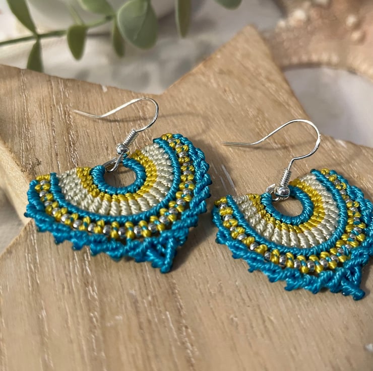 I have created and designed these earrings using the intricate knotting craft of macrame, using extremely strong 0.5mm C Lon thread.