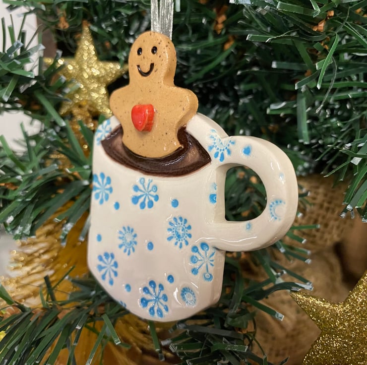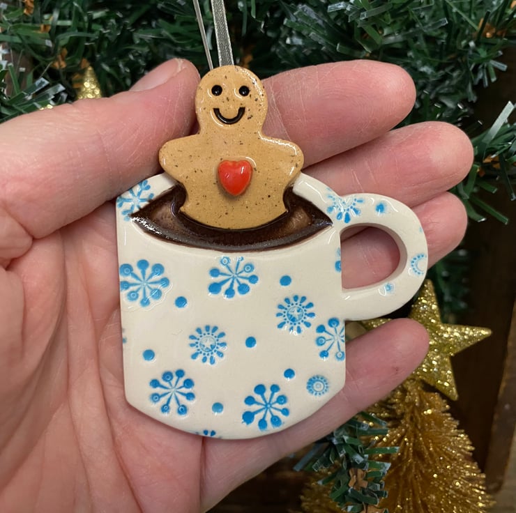 This cute little Christmas decoration features a gingerbread man swimming in a mug of hot chocolate. It has been decorated with pattern and then glazed. It has been fired twice and finished with a glossy clear glaze. Plain on the back. It measures 6cm x 7cm x 1cm deep deep and hangs from a metallic silver ribbon.