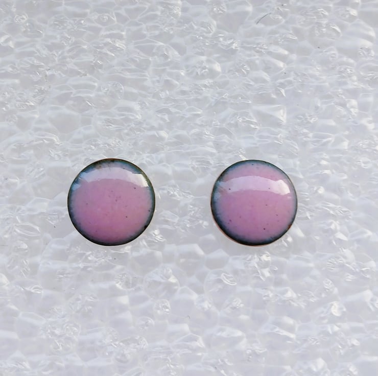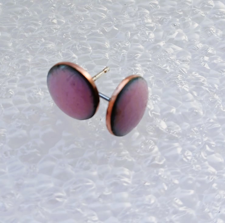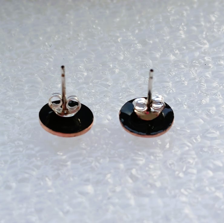 A pair of domed copper stud earrings in pink. The earrings have been kiln-fired and each measures 10mm in diameter, with sterling silver posts and scrolls (aka butterflies). The backs have been finished in glossy black enamel and they are supplied with a little organza pouch.