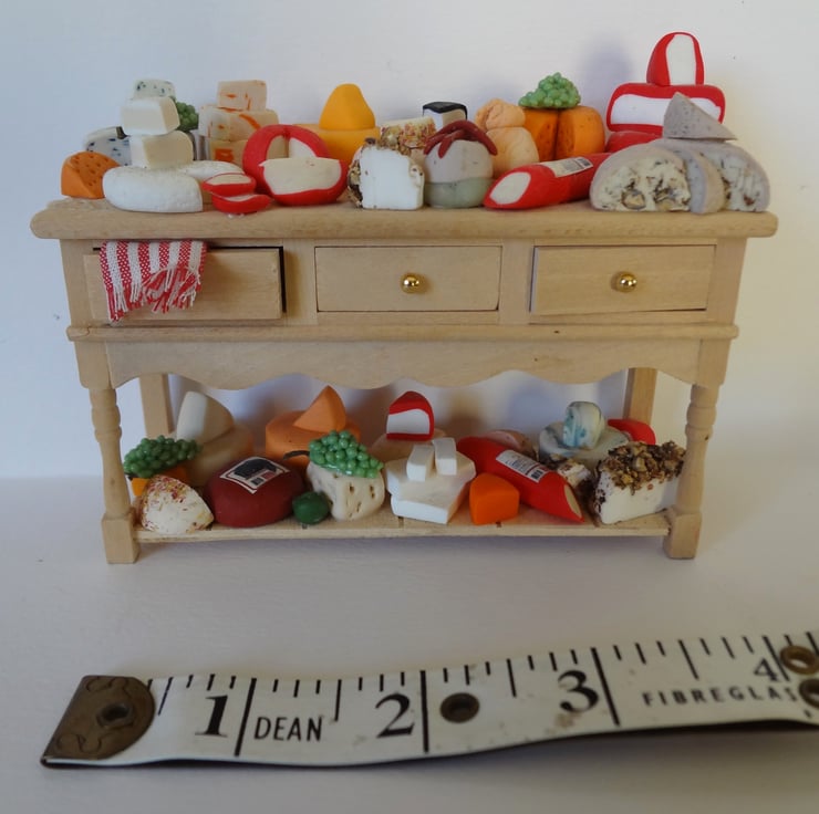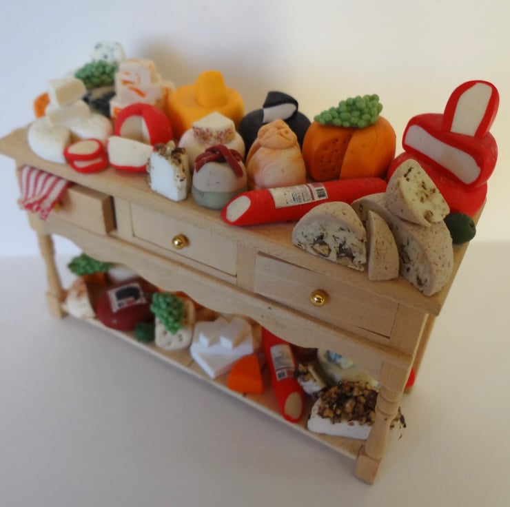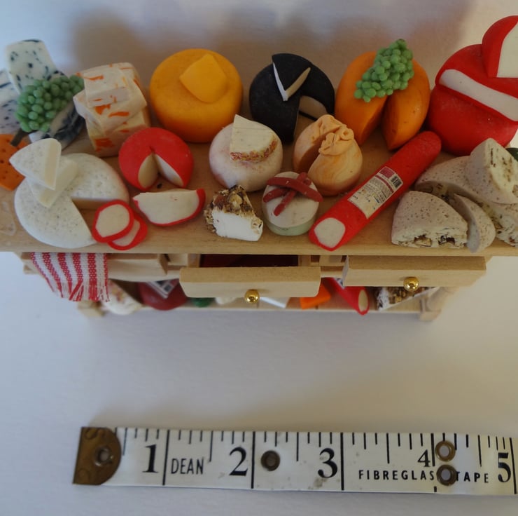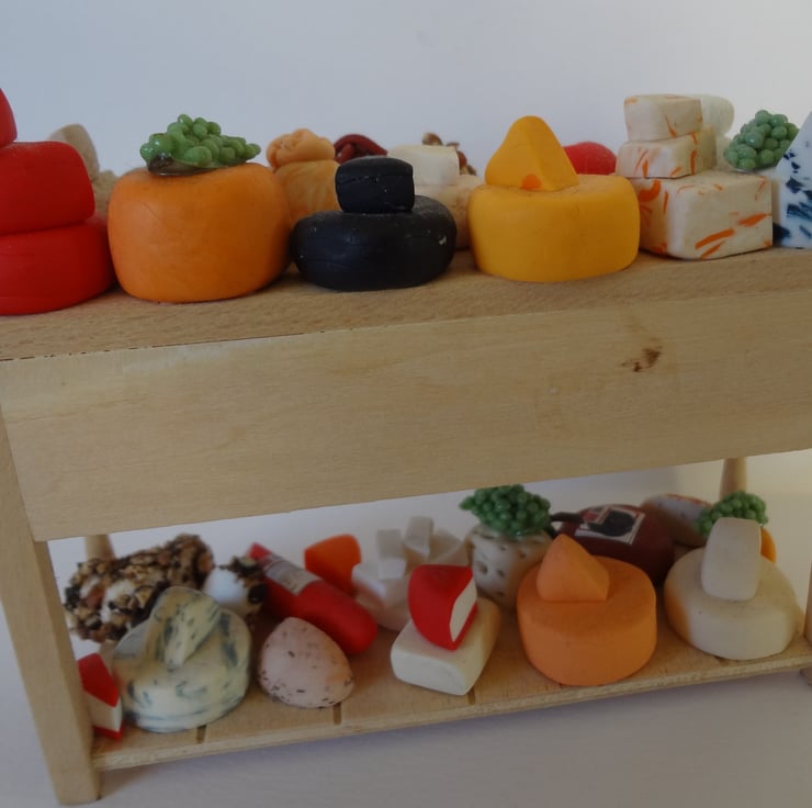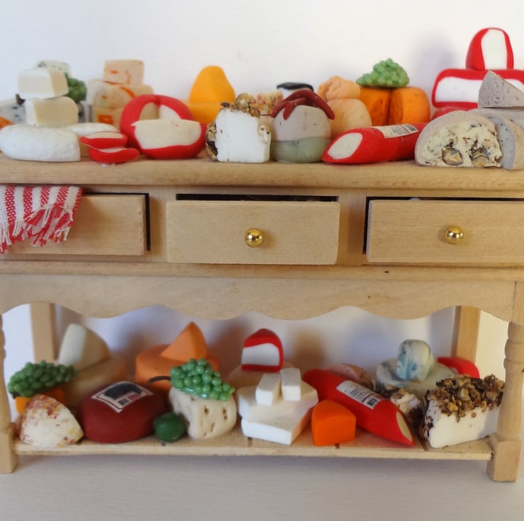 Dolls house miniature cheese selection. This is covered in various cheeses all made from Fimo and glued down.