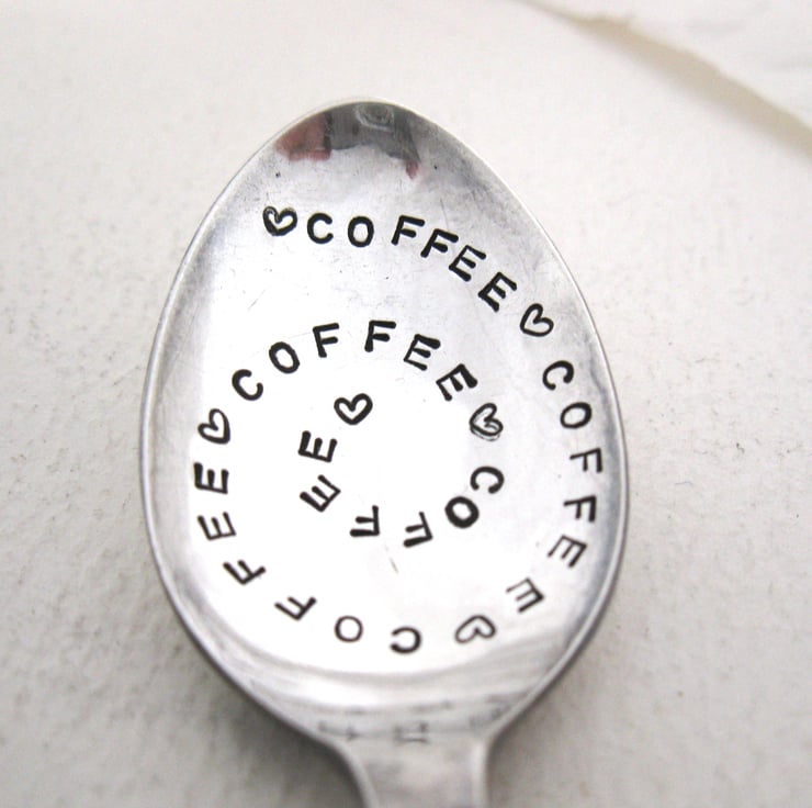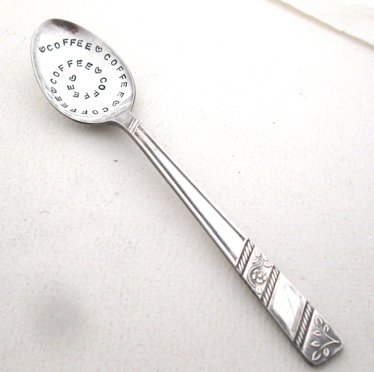 A hand stamped vintage silver plated coffee spoon with a floral handle. I've stamped tiny hearts and several iterations of 'COFFEE' in spiralling black lettering in the bowl.