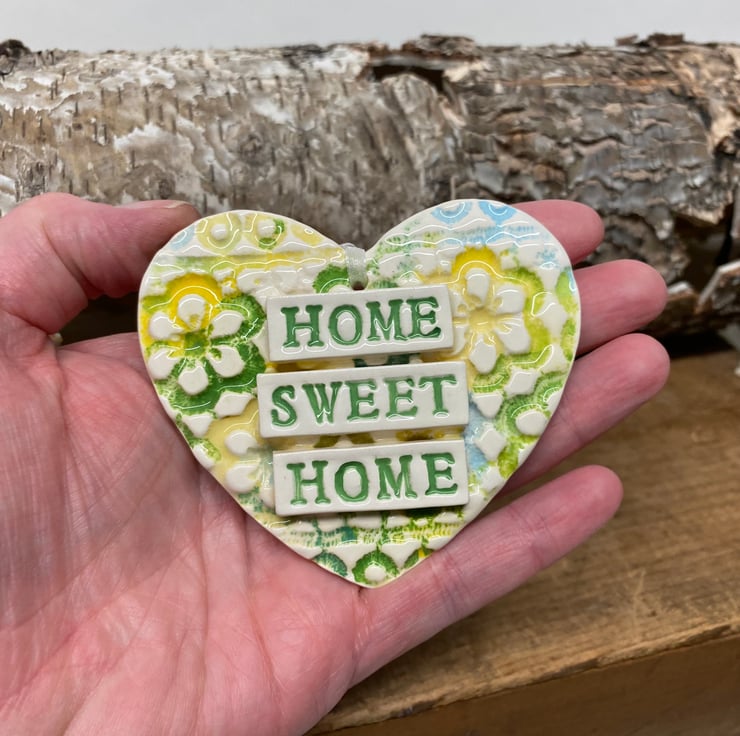 This ceramic heart is made from white earthenware clay, imprinted with pattern and colour and finished with a clear, glossy glaze. It has been fired twice, once to the bisque stage and then a second firing for the glaze. 8cm x 7.5cm, 5mm thick.