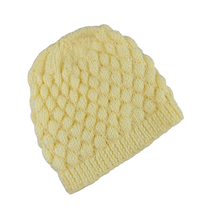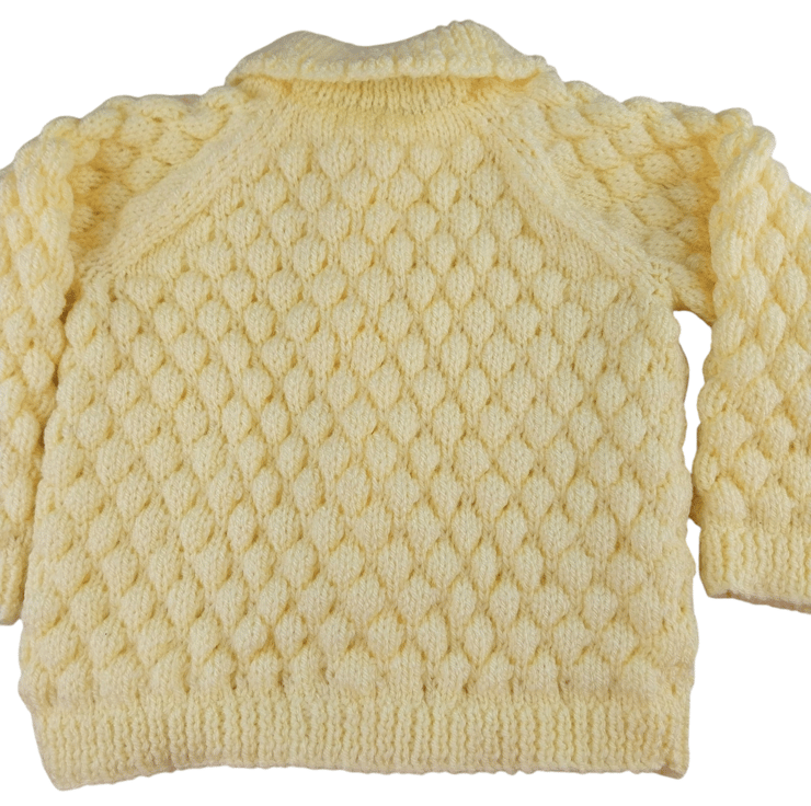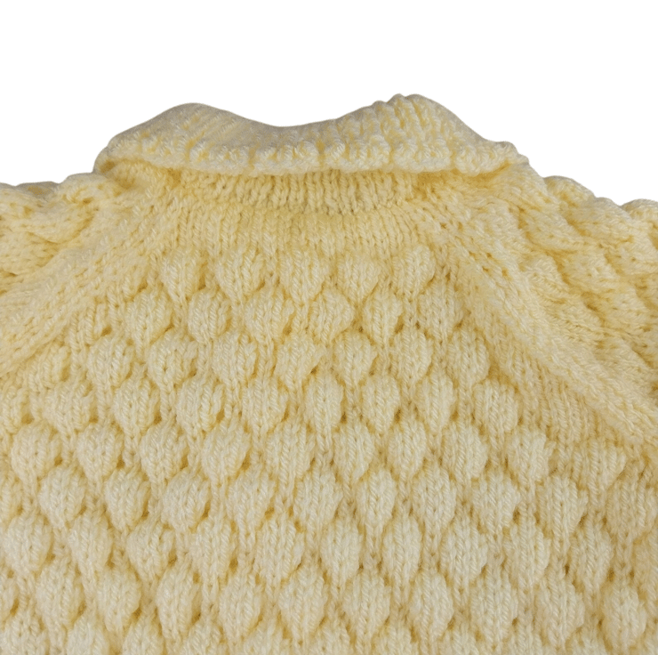 This hand-knitted lemon baby cardigan and hat set is perfect for babies aged 0-9 months. Featuring a soft, textured bubble stitch pattern, this gender-neutral set is not only cosy but also visually appealing, making it an ideal newborn gift or baby shower present. The cardigan has adorable chick buttons, raglan sleeves, and a scalloped collar, while the matching hat completes the look for any occasion.