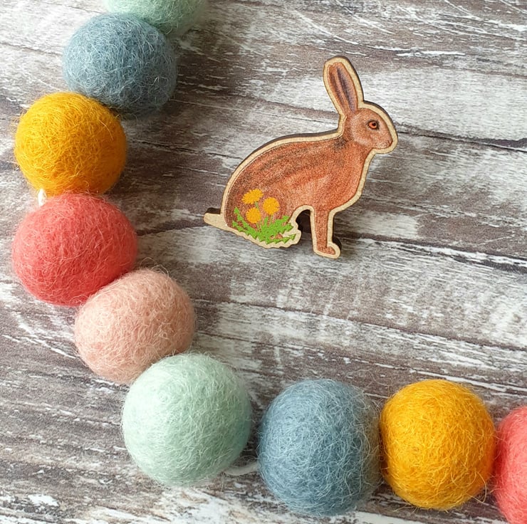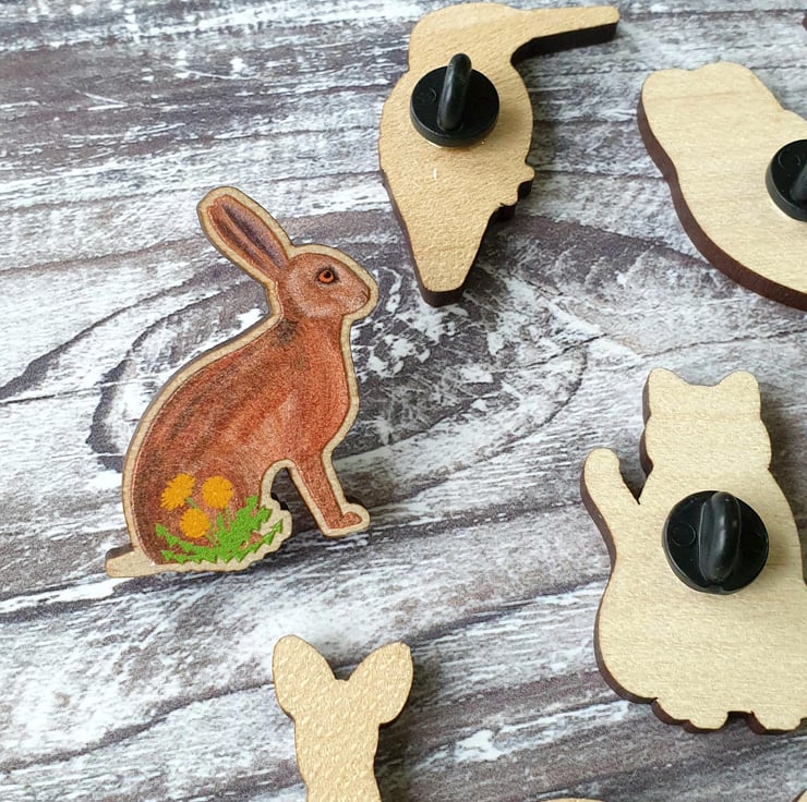 A shaped wooden pin brooch printed with my illustration of a hare. Perfect for carrying a little bit of wildness with you wherever you go.