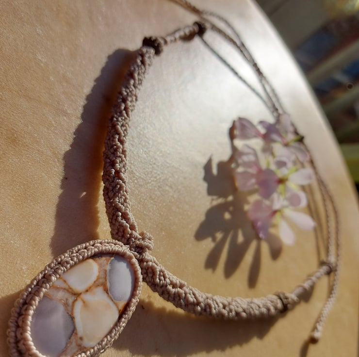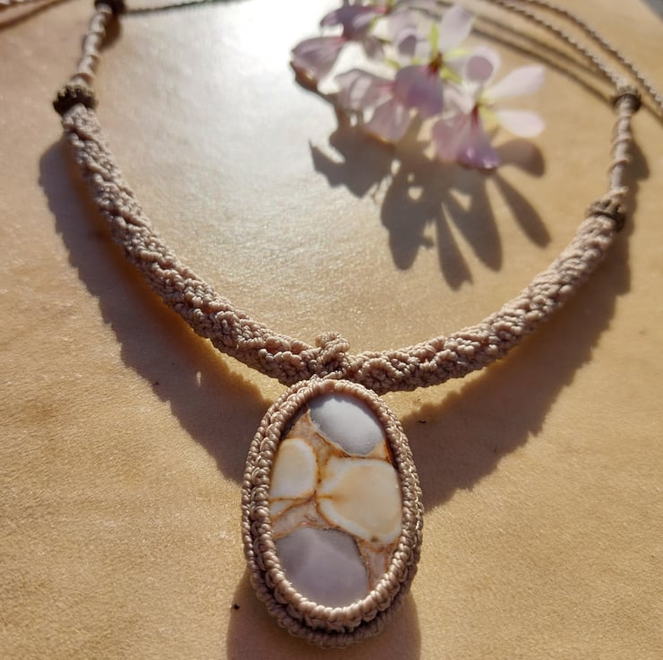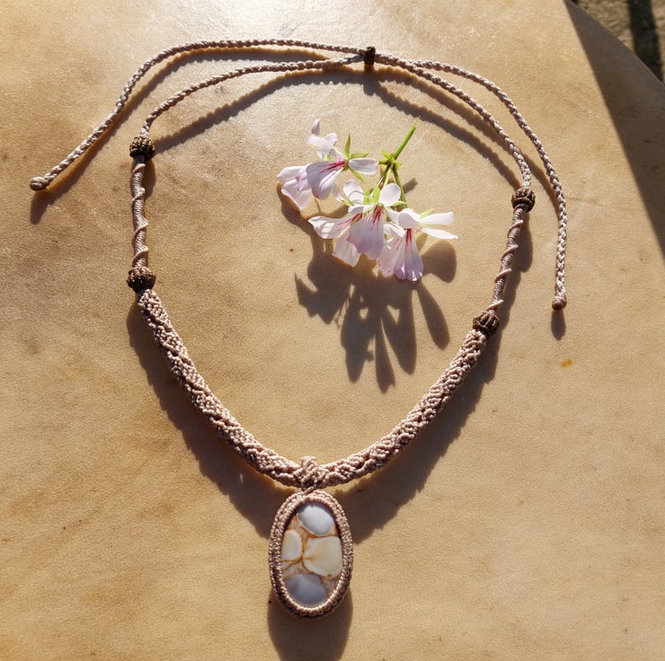 Handmade micro macrame necklace with a cobra jasper cabochon. Adjustable cord.