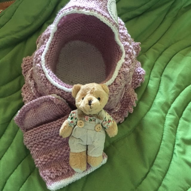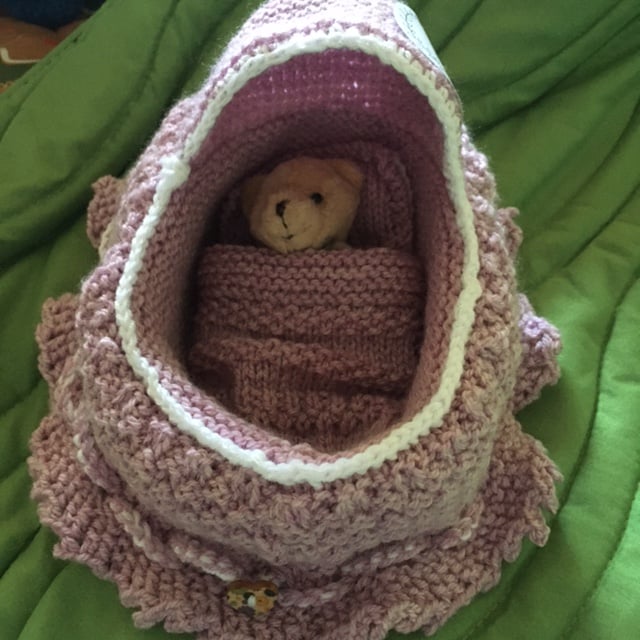 All children like to carry a little something around with them in their pockets and this little teddy bear is small enough to do just that. He or she (for you can choose a boy teddy or a girl teddy) comes with a tiny sleeping bad which fits into the matching cradle. And then it can be transformed into a small carrying bag with everything safe and snug inside. (See photos).
