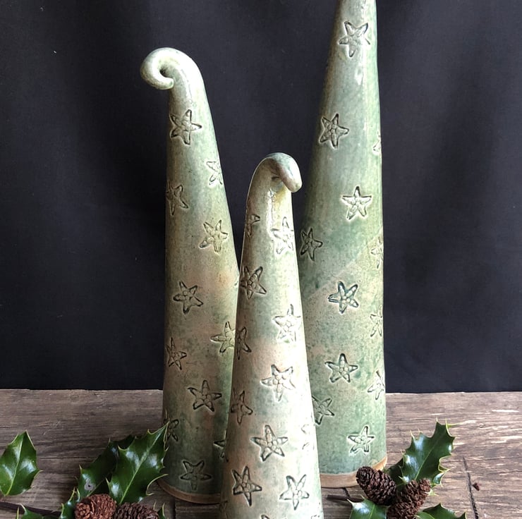 Set of 3 quirky hand-built decorative trees with with star stamp decoration.