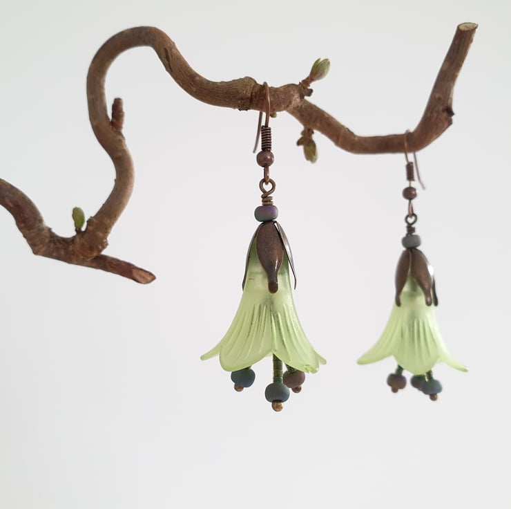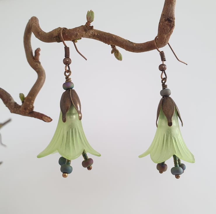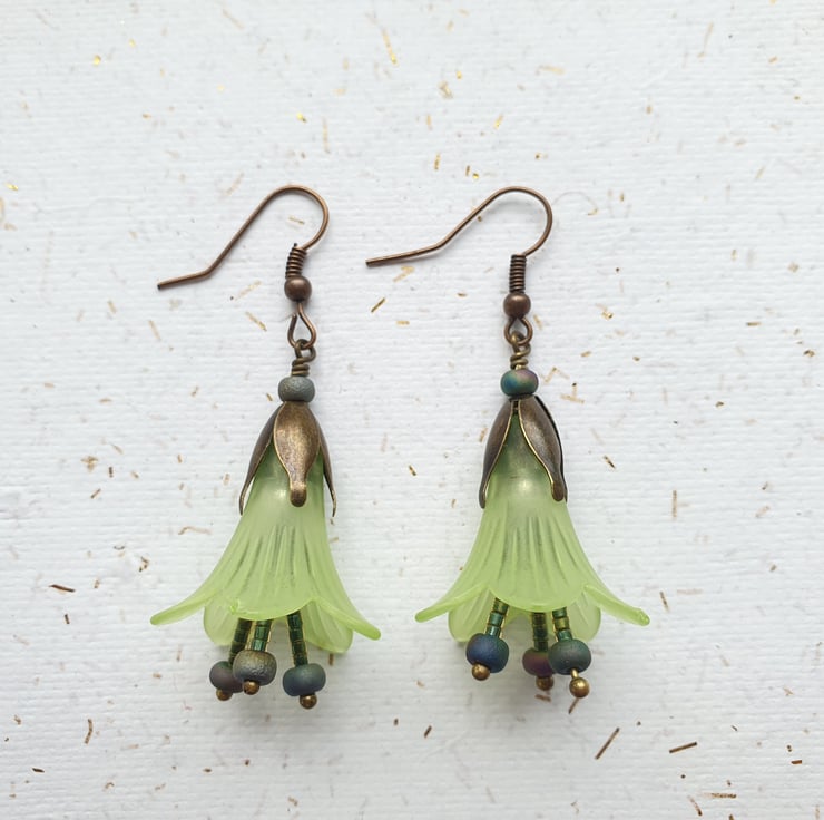 With colours reminiscent of a mossy woodland these lucite flowers have stamens made of tiny beads, they are hanging on earwires in an antique brass finish.