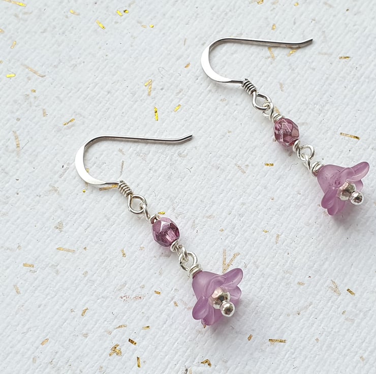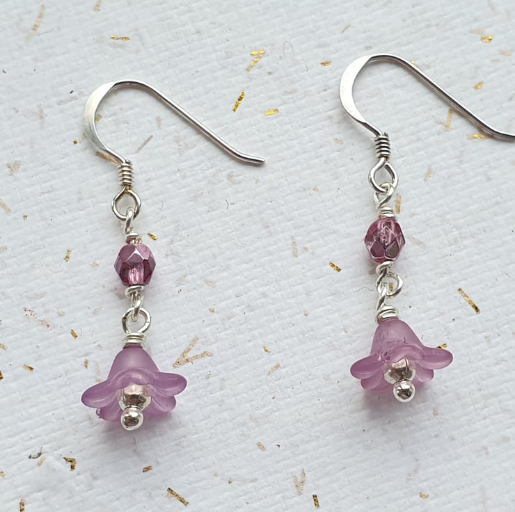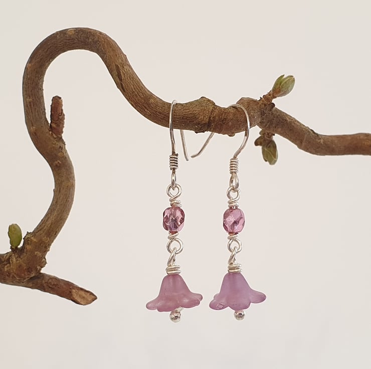 Dainty flowers in a pinky mauve colour with a silver centre, hang below sparkling pink crystals. Sterling silver ear wires.