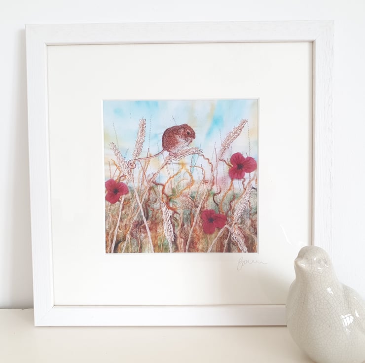 A framed print of an original textile picture. A painted cotton background, wool and silk to add texture and free machine embroidery to add the detail. This photographic print still captures the textures of the original.