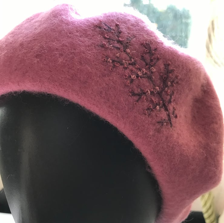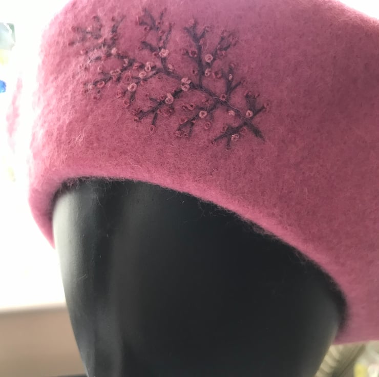 100% pure new wool, Woolmark Beret embellished with hand embroidery of a stylised branch. The branch is embroidered in a brown thread then I have added some pale pink and rosy pink buds to the branch.