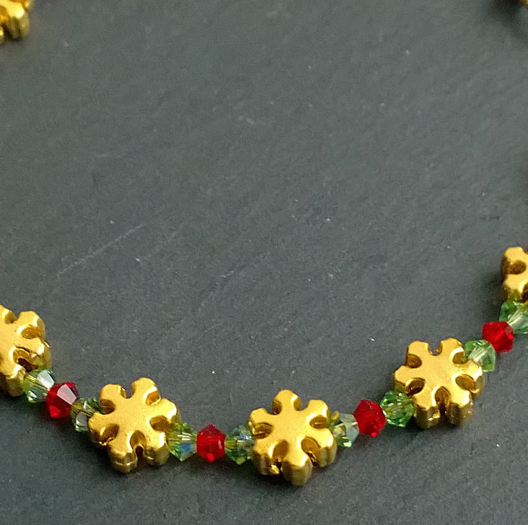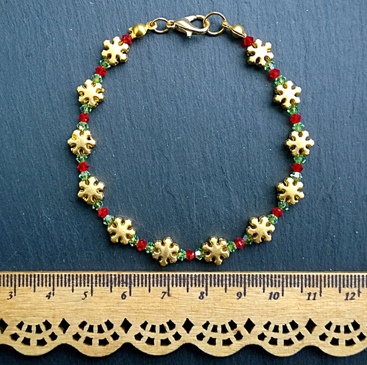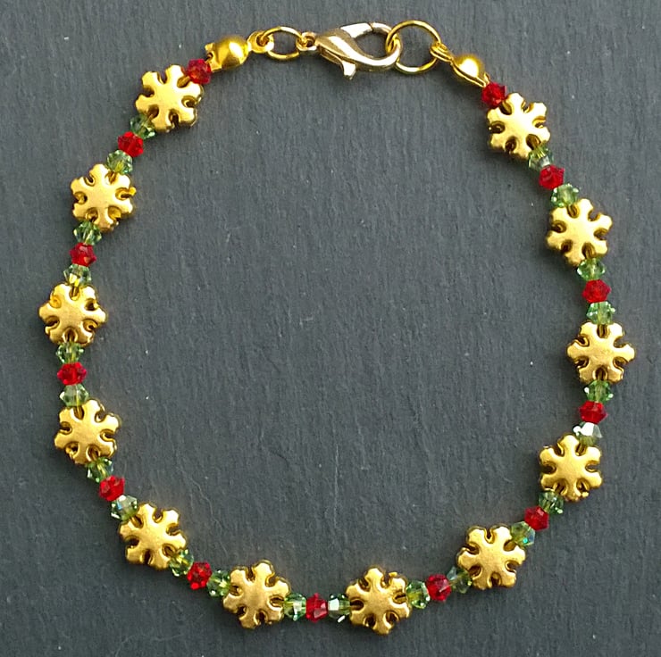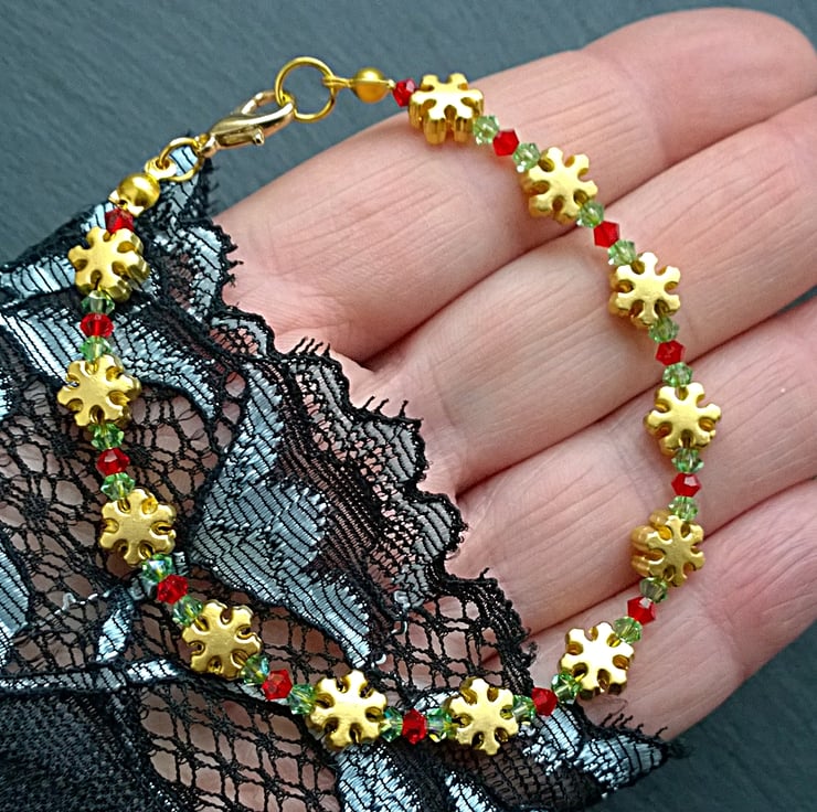 This bracelet is made from a series of 24 carat gold plated matte snowflakes flanked by green and red Swarovski crystal beads. The green beads are AB (aurora borealis) half coated so have an extra layer of subtle shimmer reflecting many colours.