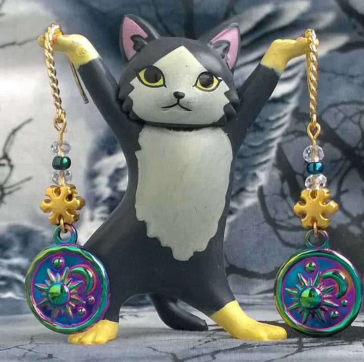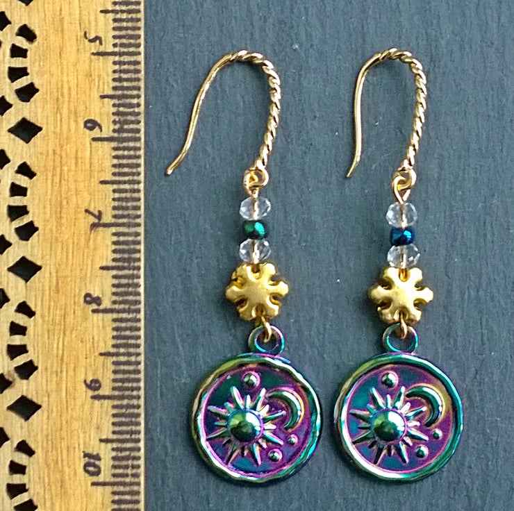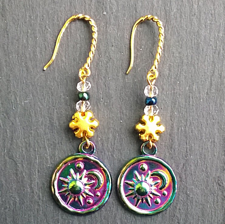An eye catching pair of handmade dangle earrings featuring a rainbow plated sun and moon charm, a matte 24 carat gold plated snowflake and faceted clear quartz crystal beads with a peacock sheen glass bead. These are one of a kind earrings, you will receive the pair shown.