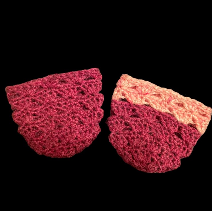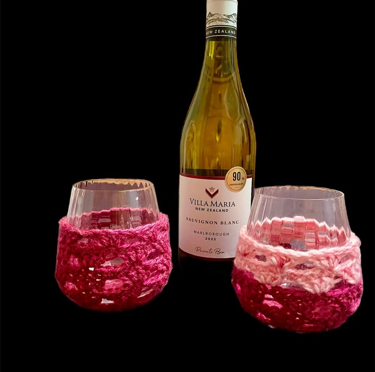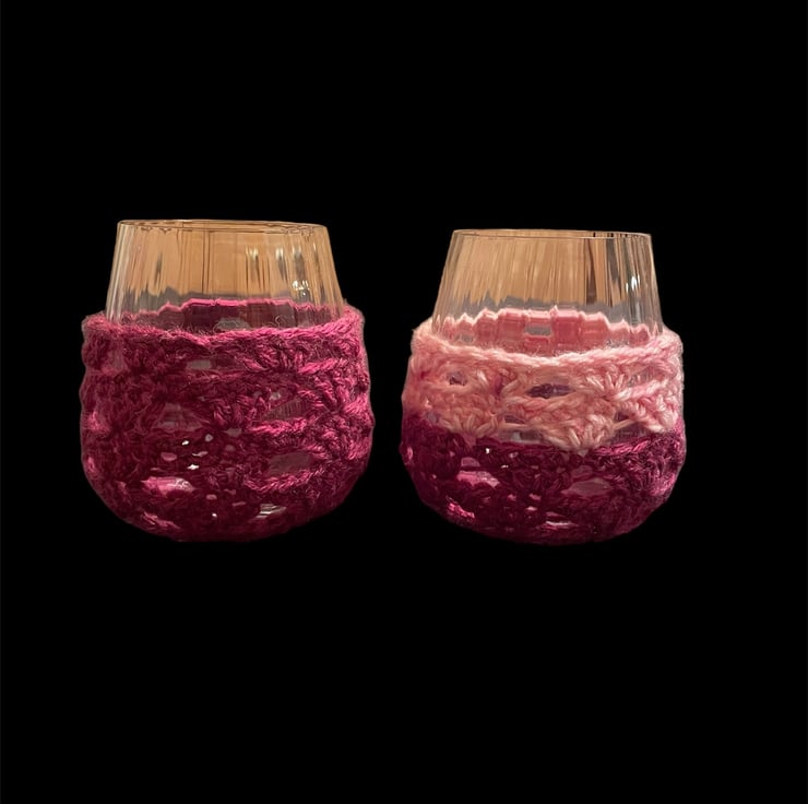 Each cosy is crocheted with acrylic yarn and measures approximately 10 x 12 cm which is a bit less than a standard stemless glass as it needs to stretch over the glass to fit snuggly.