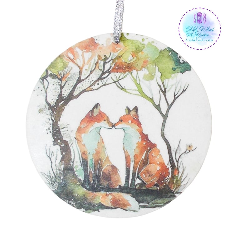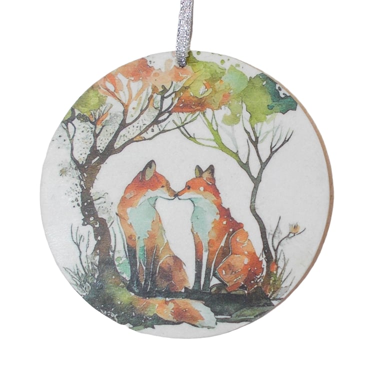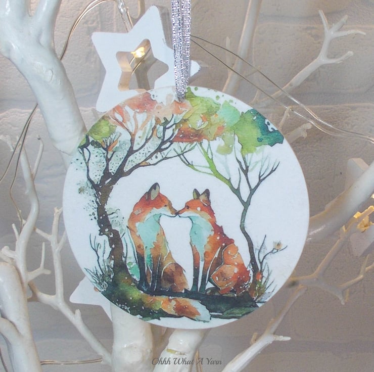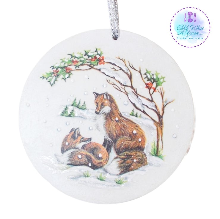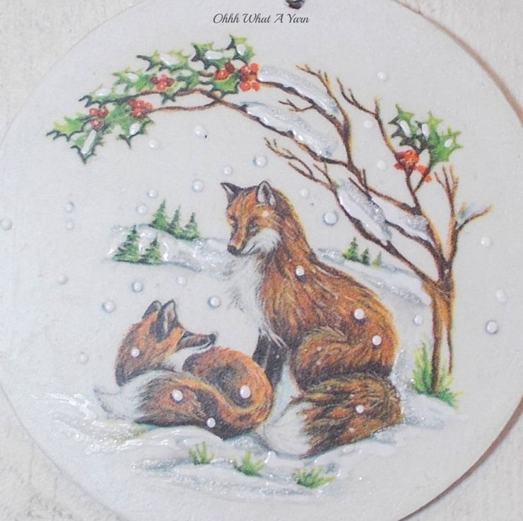 The reverse of the decoration has been decoupaged with a rice paper image of two more foxes.