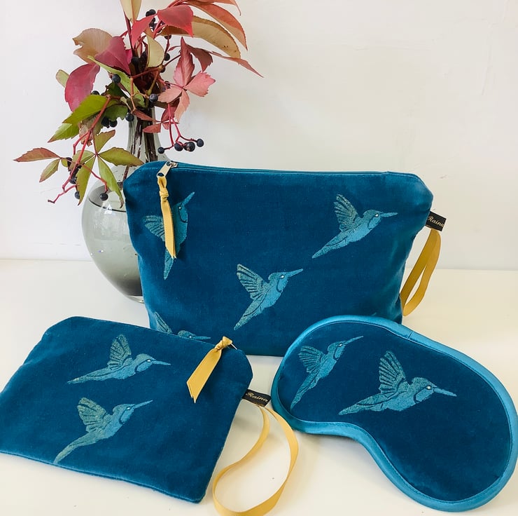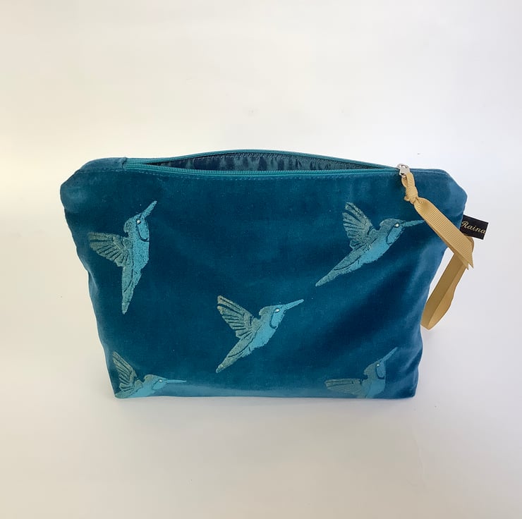 Introducing the Teal Hummingbirds Velvet Makeup Bag, an exquisite addition your daily makeup routine and unique art accessory.
