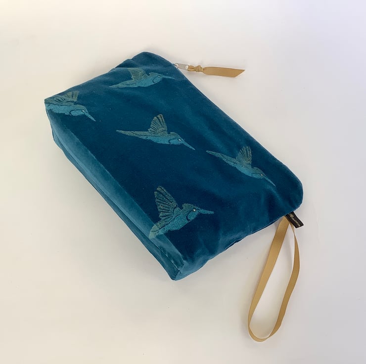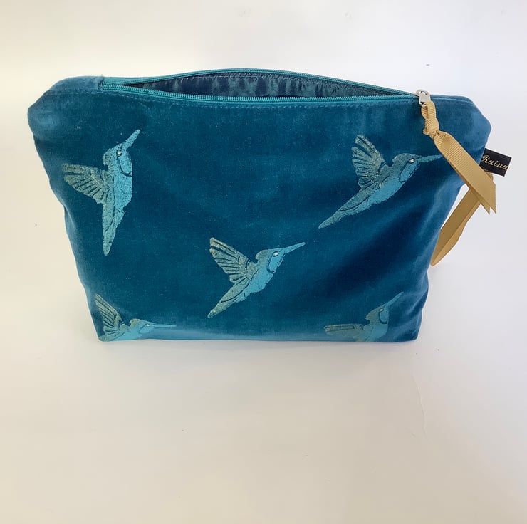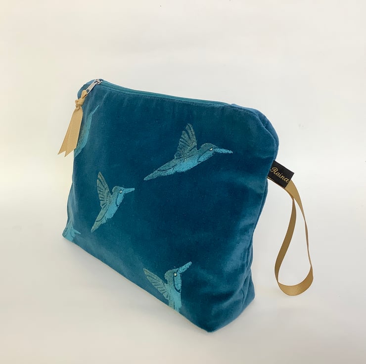 This luxurious teal blue bag showcases a stunning design of delicate hummingbirds. These little messengers of joy, love and good luck will add a touch of elegance to your vanity or travel essentials.