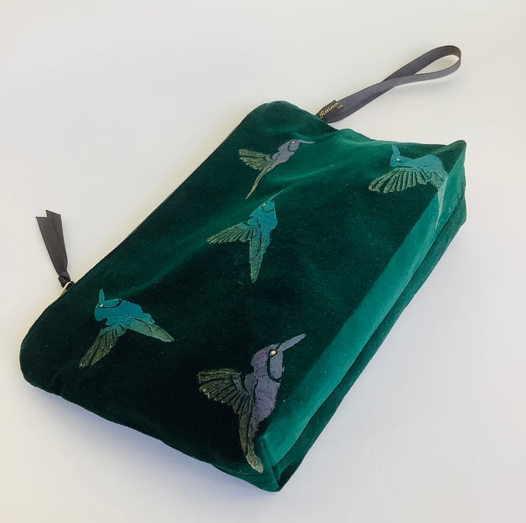 This luxurious green bag showcases a stunning design of delicate hummingbirds. These little messengers of joy, love and good luck will add a touch of elegance to your vanity or travel essentials.