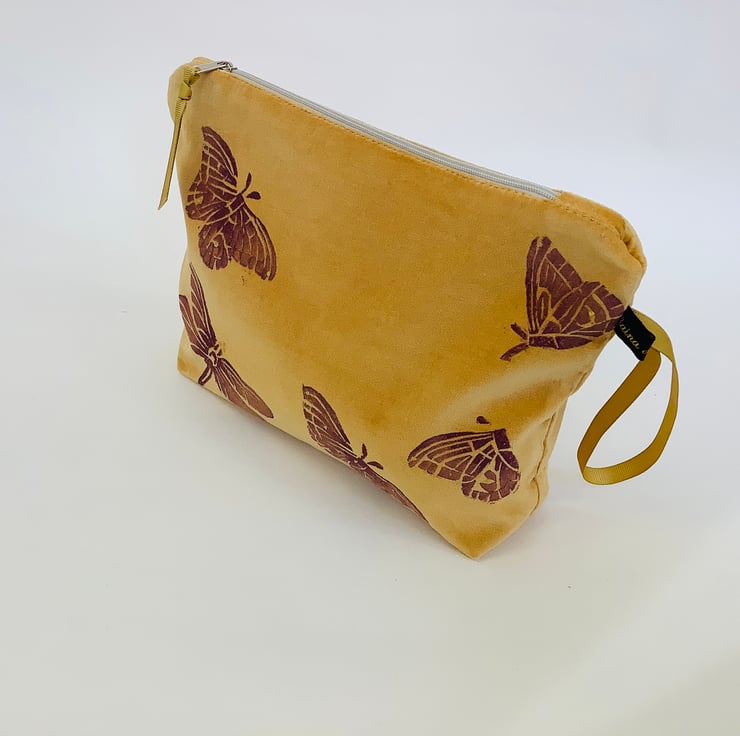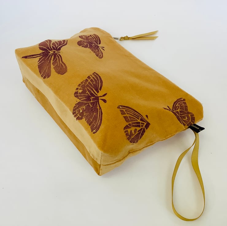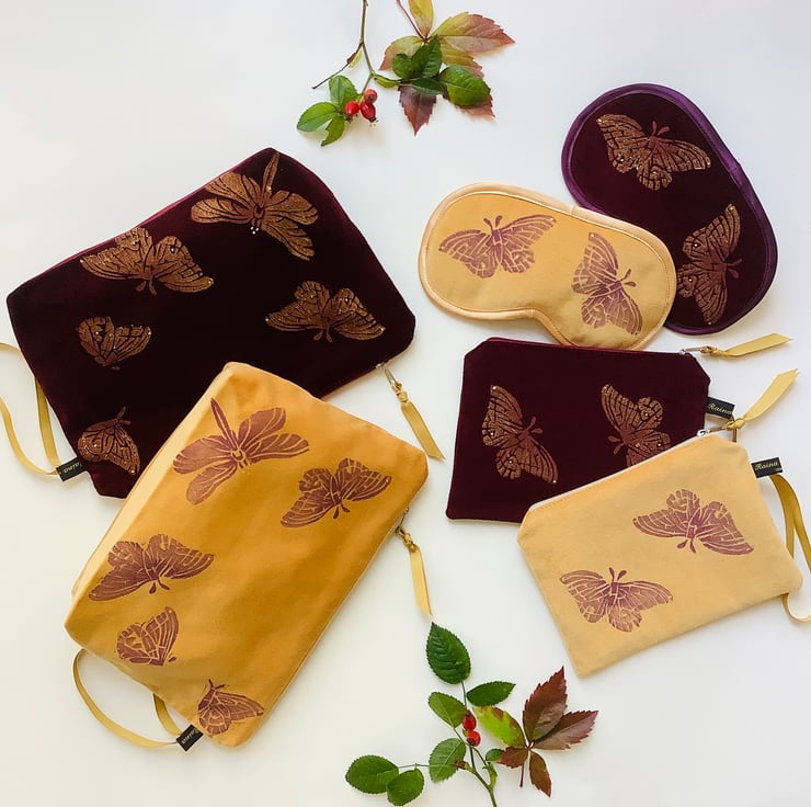 The original linocut Butterfly and Dragonfly design is hand printed using eco friendly inks on to naturally sourced 100% cotton velvet. The print is made by rolling my original hand carved linocut block with ink and then pressing it face down on to the fabric.