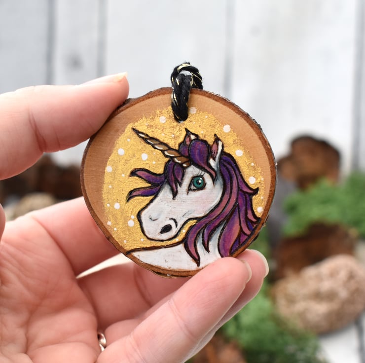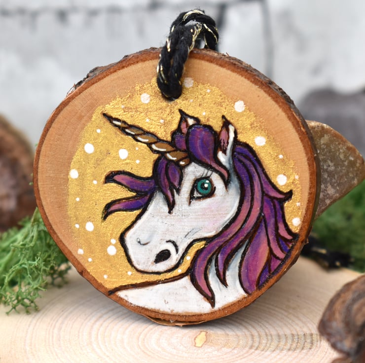 A beautiful dinky wood burned decoration for the home with a festive theme! This one has a unicorn. Decorated with gold paint, and art pencils.