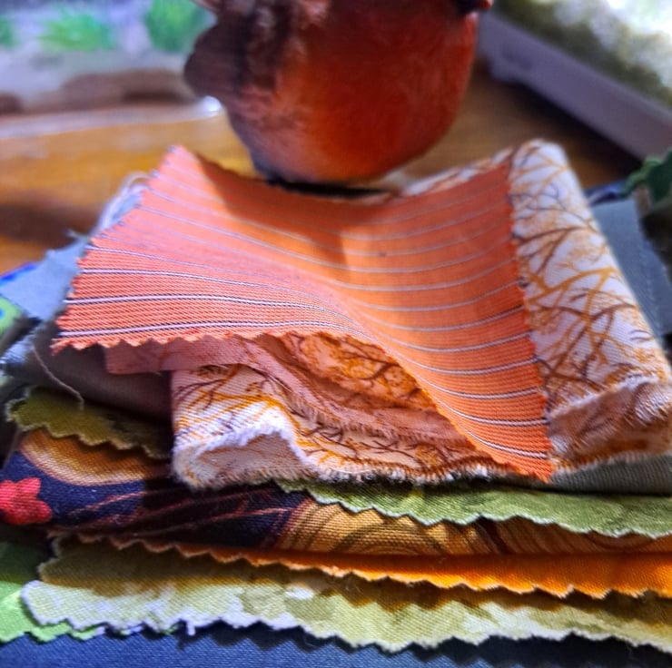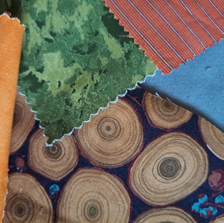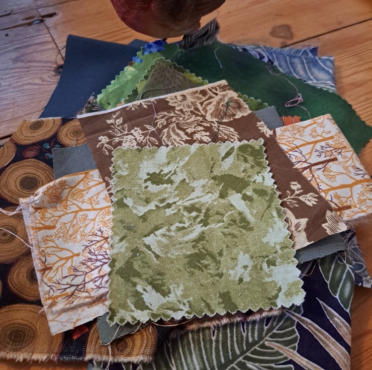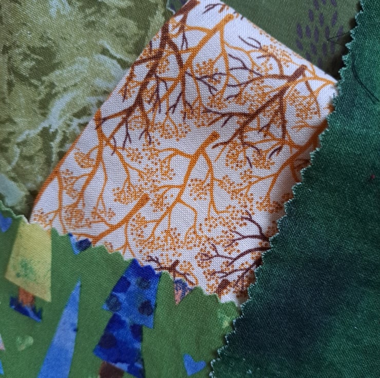 Green and serene, this bundle of earth tone scraps would add depth to any textile project, from patchwork to collage. Sixteen pieces of all shapes and sizes. Nearly all cotton - one is viscose and one cotton mix.