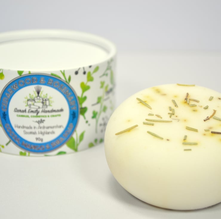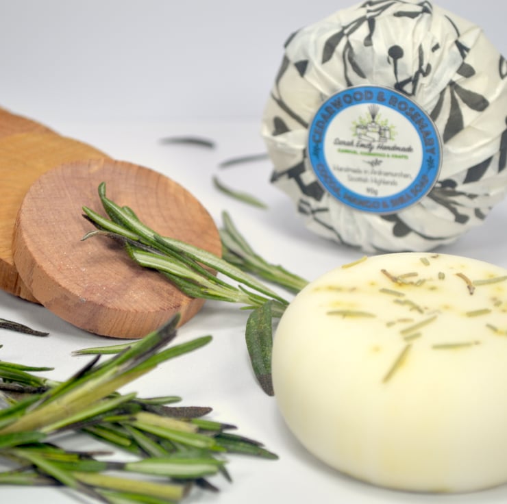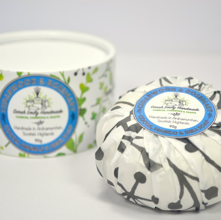 Our Cedarwood & Rosemary soap is lovingly handmade in the Scottish Highlands. We use a luxurious Cocoa, Mango & Shea Butter soap base, the addition of essential oils & a little decoration to create a beautiful bar of soap.