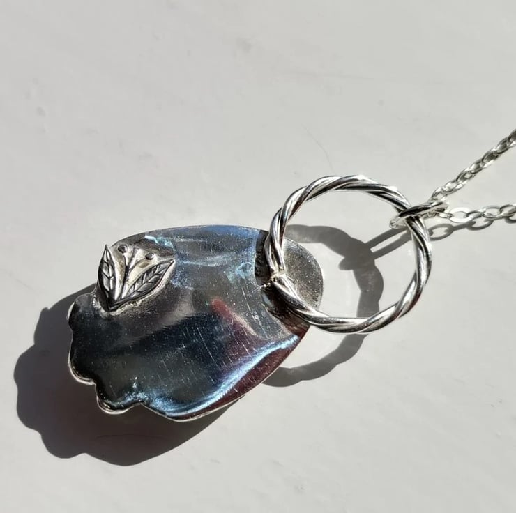 Solid silver back with little leaf, twisted silver detail, inverted heart design around the fossil and my recycled "bubbles" which I make by melting down my leftover silver