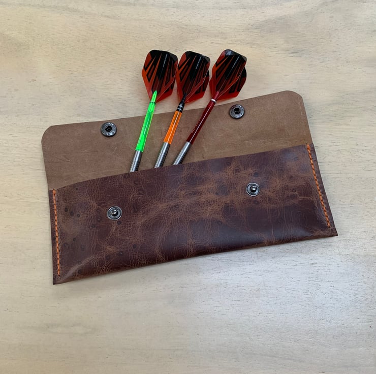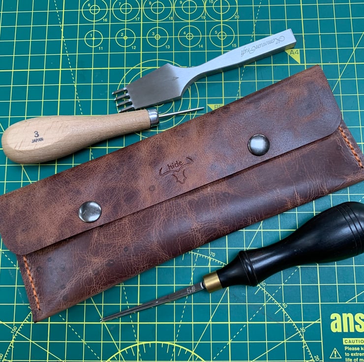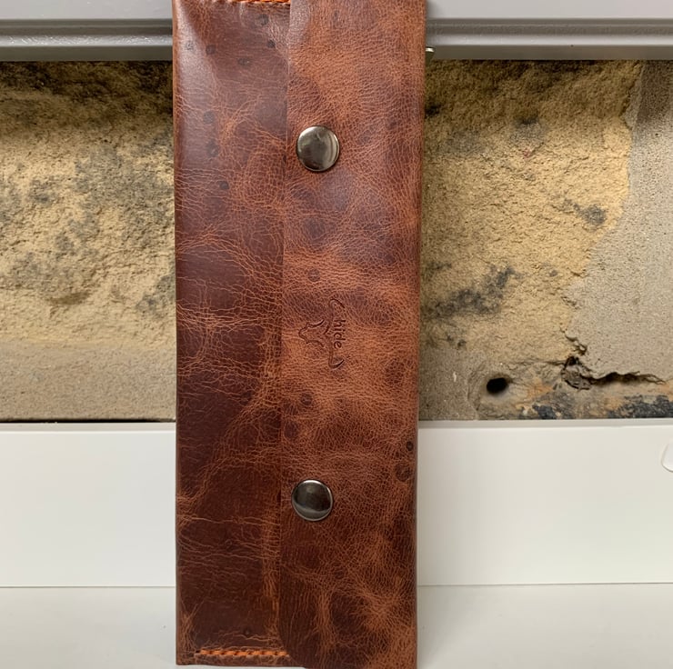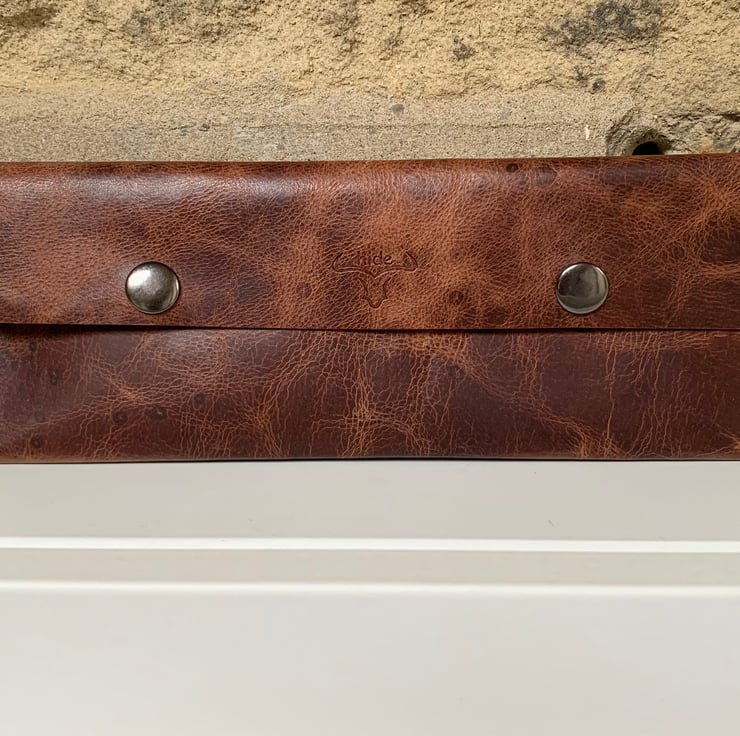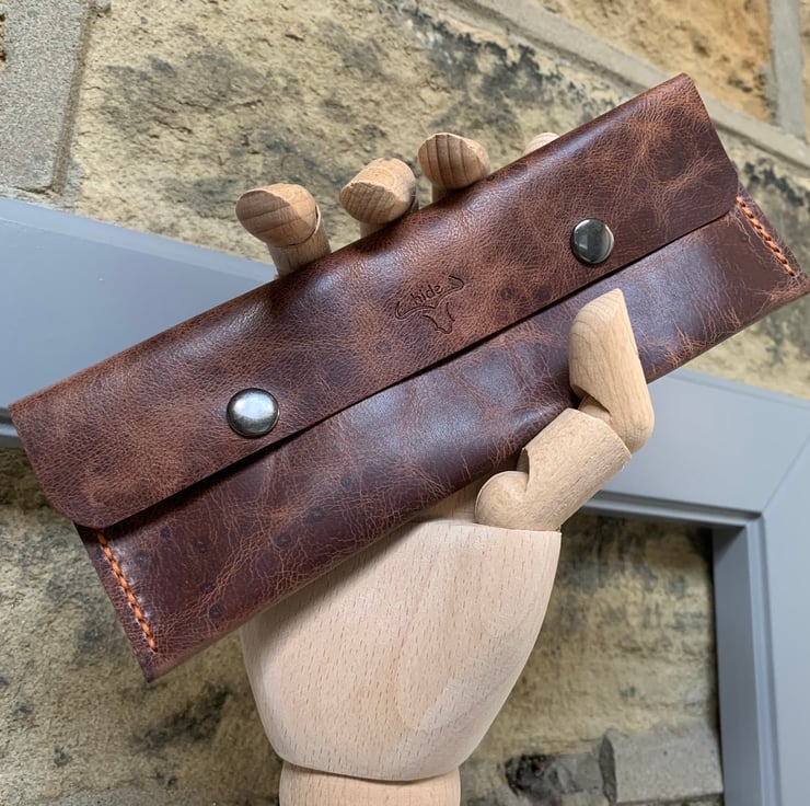 The Tilda unisex pouch is handmade using kid leather in brown hues from a tannery here in the UK and saddle stitched with Ritza Tiger waxed thread in a bright orange colour for strength and durability.