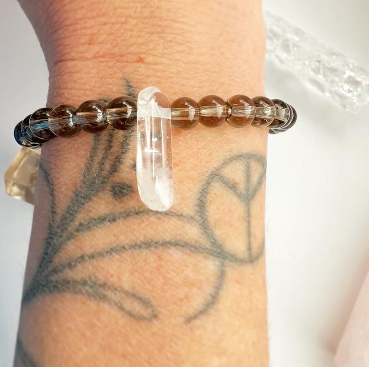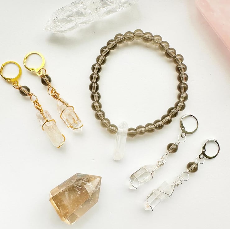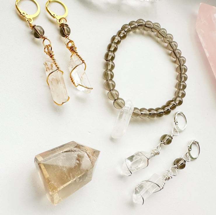 Grounding Smoky Quartz and Quartz Point Gift Set. Earrings wire wrapped on either Silver or Gold plated along with the choice of adding a stretch bracelet