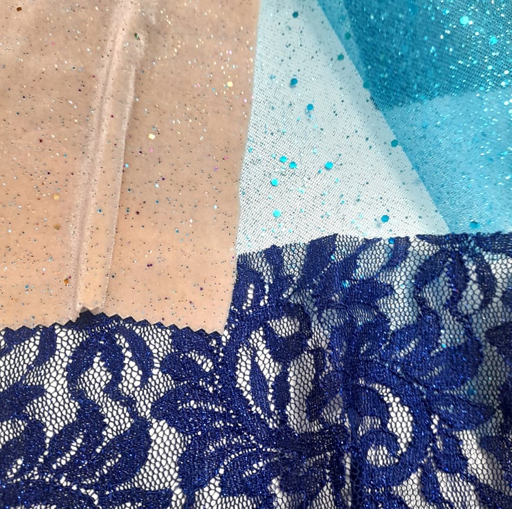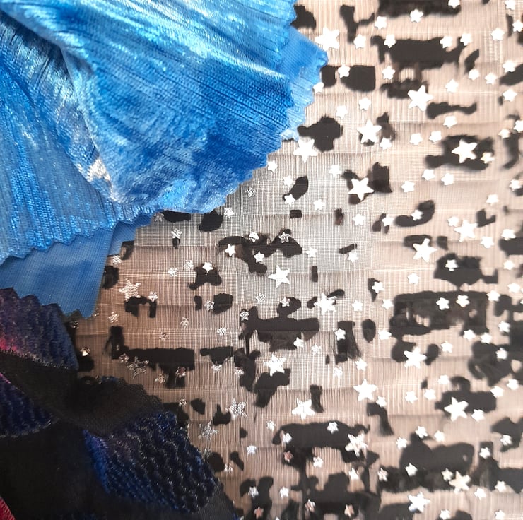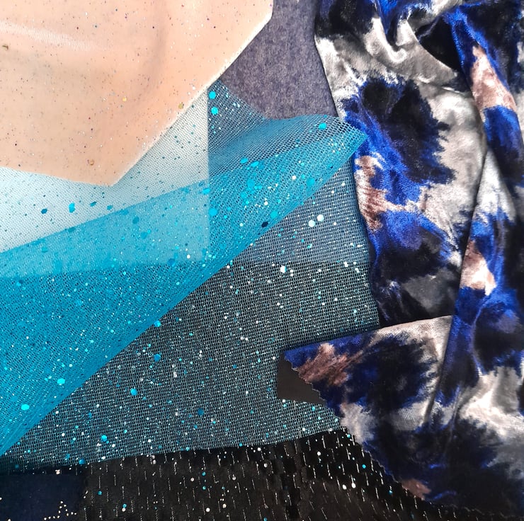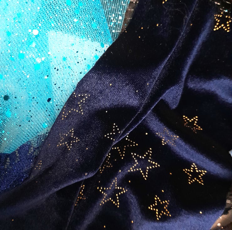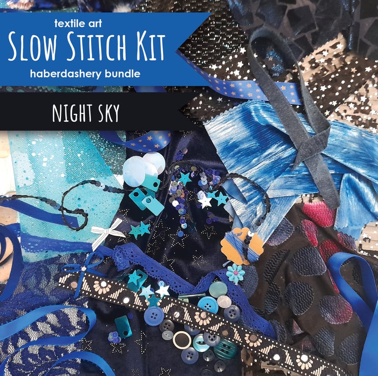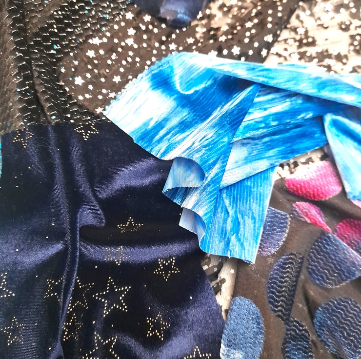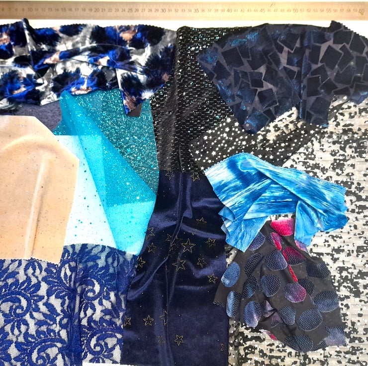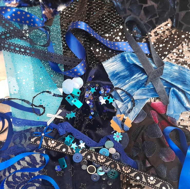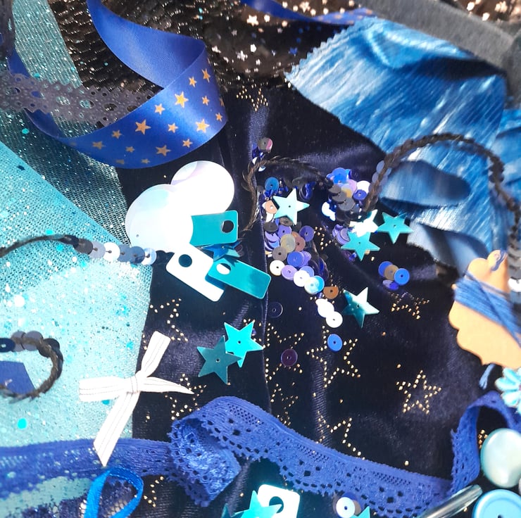 This box has a night sky / blue theme, each box is very slightly different but you will receive mostly of what is in the photos. Variations are with the cut of the fabrics and maybe one of the patterns. The fabrics are a mixture of natural and man-made - fabulous colours and textures.