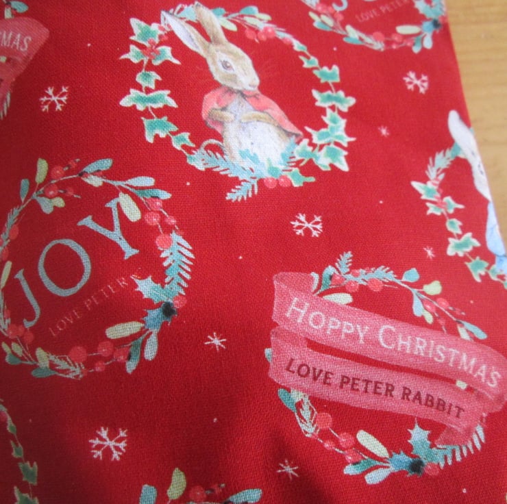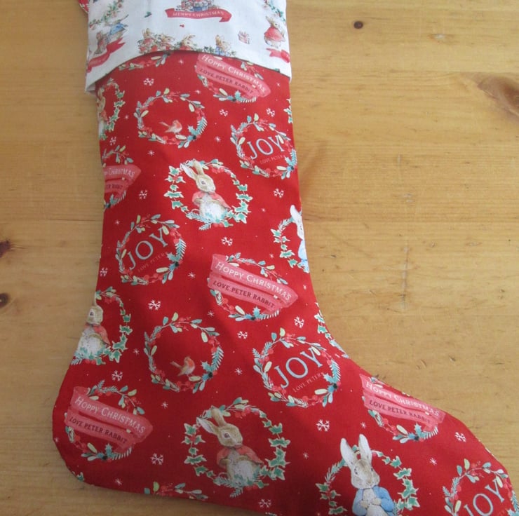 Peter Rabbit themed CHRISTMAS STOCKING, great for a child. Make the room feel fun and festive! Peter, seasonal greetings and animals scenes scattered across charming red printed fabric, with a contrast cuff in similar white printed fabric. Matching hanging loop at top. Fully lined in white fabric.