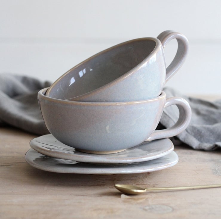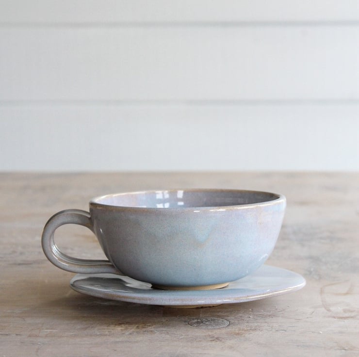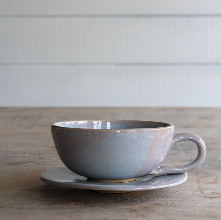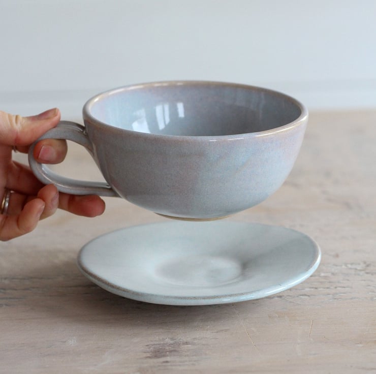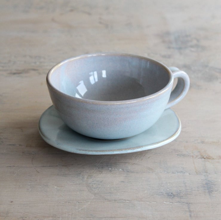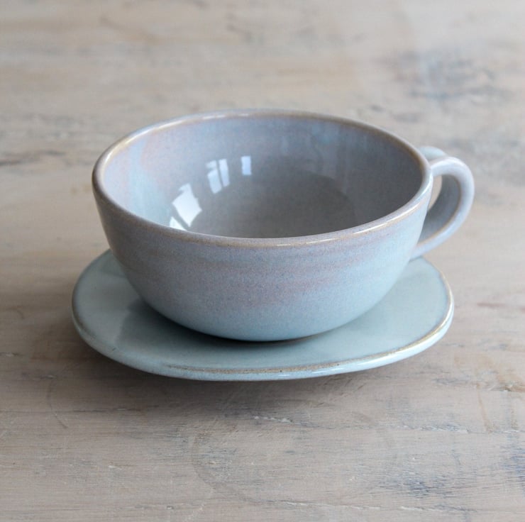 Enjoy your coffee from this volumious cup on a misty winter morning. A favourite design with a subtly new glaze colour; tranquil lilac. Thrown on the wheel using Staffordshire stoneware clay. Fired to 1260 degrees centigrade. Marshmallow edges of glaze flow and ripple on a canvas of the subtlest blue. Each set is unique and the cup and saucer you receive will vary slightly from the one pictured.