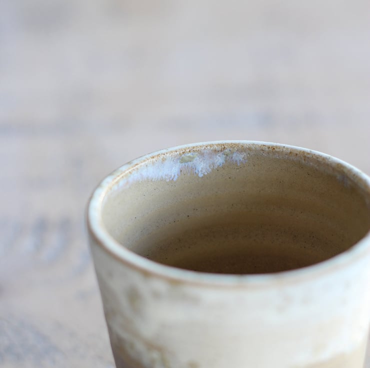 This handmade stoneware travel mug is thrown on my potter's wheel. When the mug is partially dried the base is fettled and my potter s mark added. Once bone dry it is fired to 1060 degrees centigrade. I decorate the mug by hand with a speckle white Seas Salt glaze and warm matt grey glaze - on the outside and glossy transparent on the inside. It is high fired for a second time to 1222 degrees centigrade.