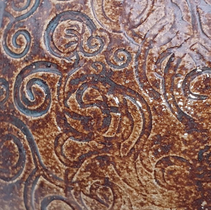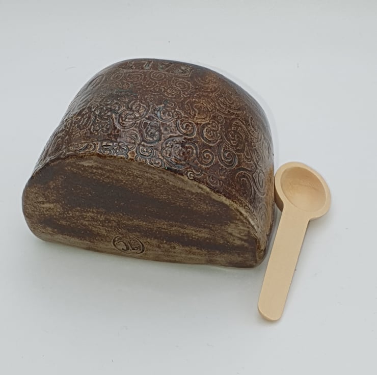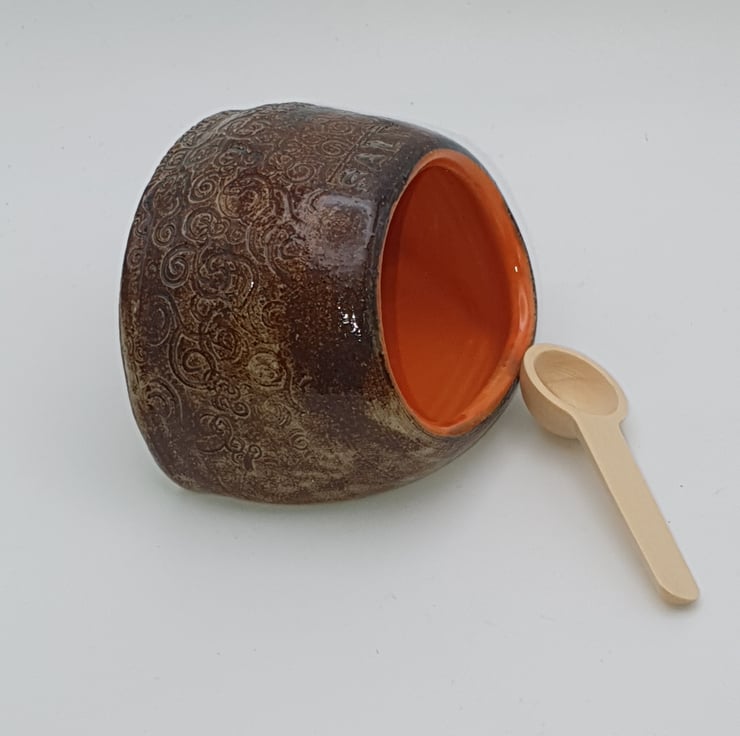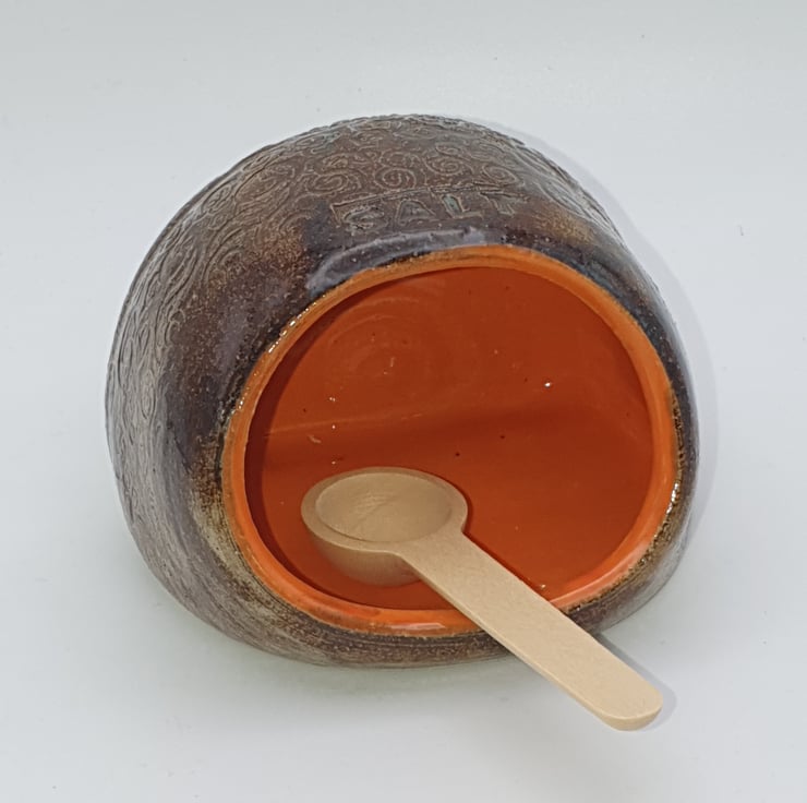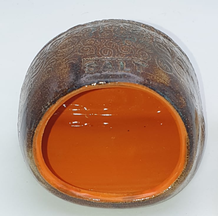 Salt pig. Wheel thrown, adjusted shape by tapping on its side. Stoneware. Glazed in a brown glaze over an imprinted pattern. 'Salt' also imprinted on top. Internal section is orange gloss.