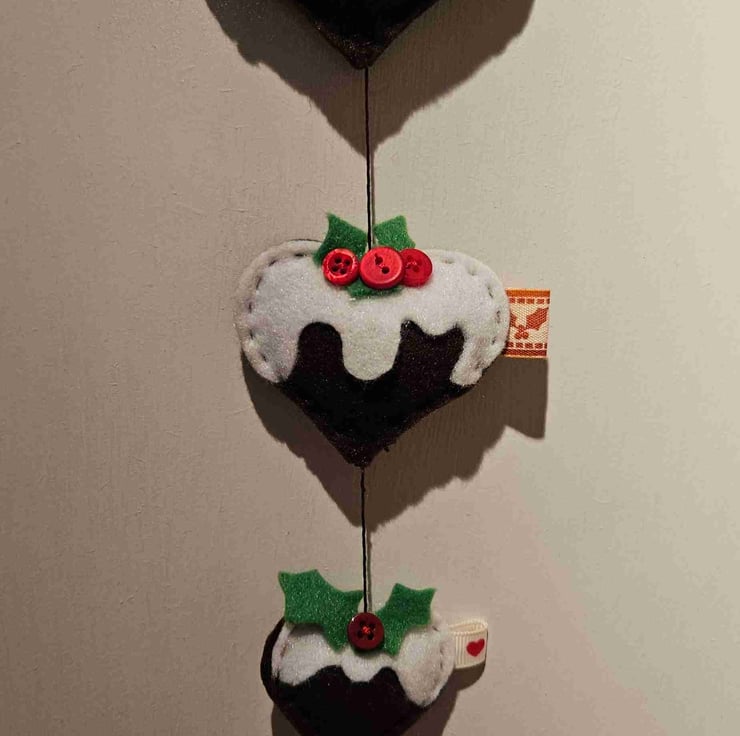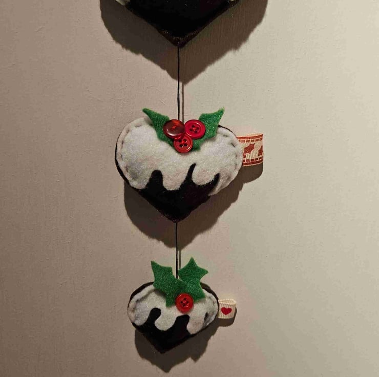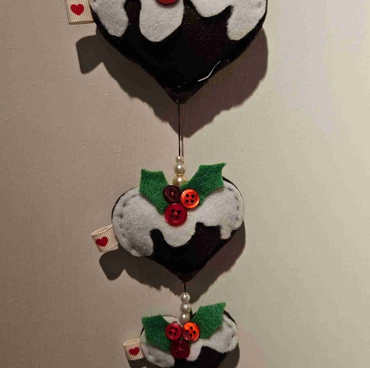 Hanging Heart decoration , Christmas puddings decorated with felt holly leaves and red berry buttons.