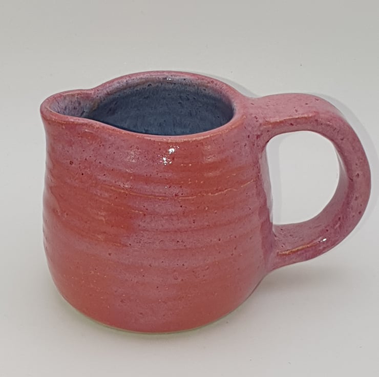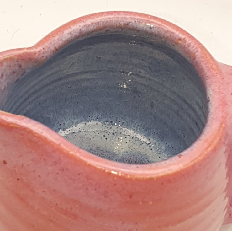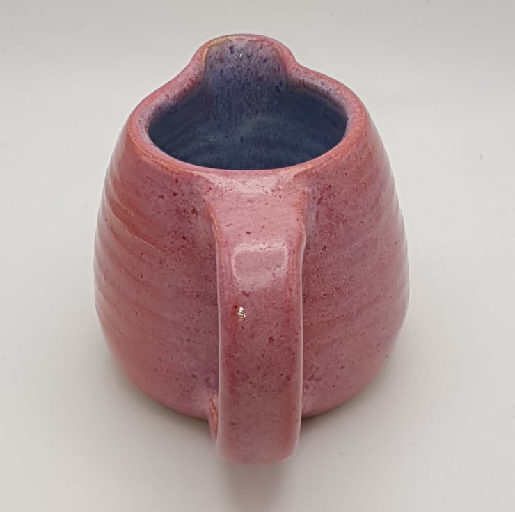 Wheel thrown milk jug. Glazed in pink and lavender. Matching items available. Stoneware. Dishwasher safe.
