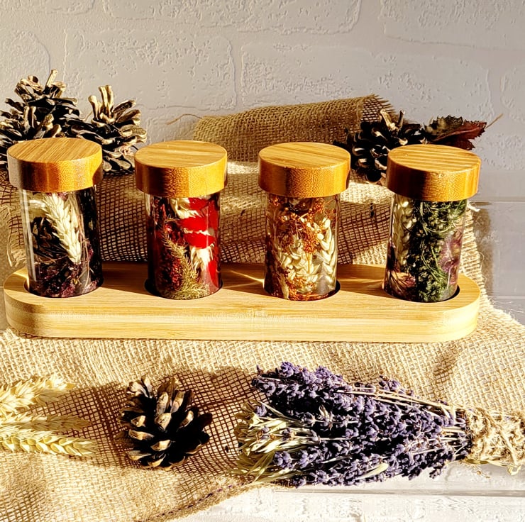 Dried flowers in a mineral oil herbarium bottle create a captivating display where delicate blooms are suspended in clear liquid, preserving their beauty.