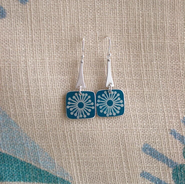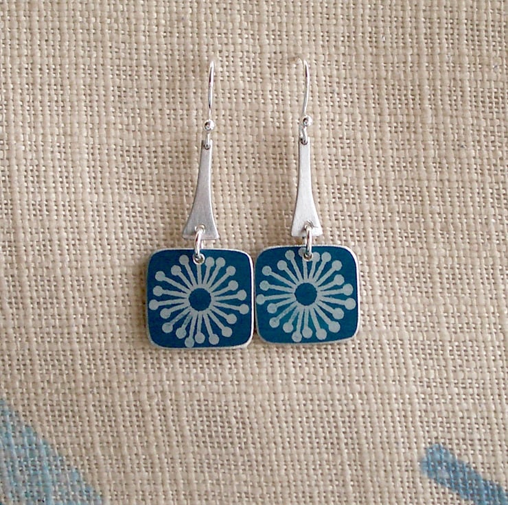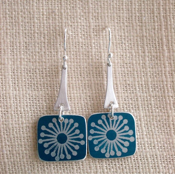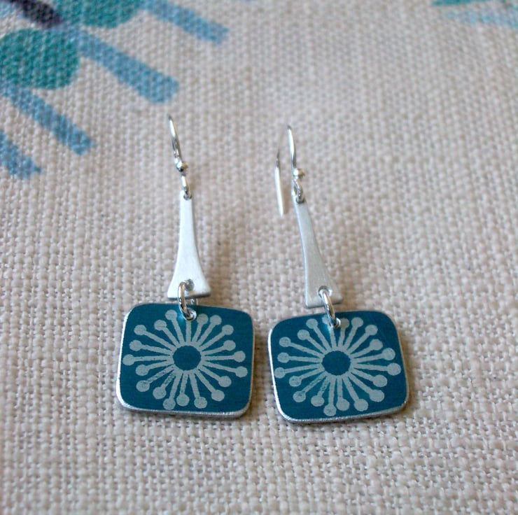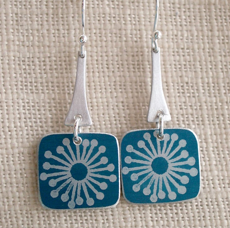 These square earrings are inspired by Scandinavian folk art design and are made from hand dyed anodised aluminium. I dye the aluminium a deep teal colour and print the starburst pattern on to the metal, the dye is made permanent through heat. I cut the square shape with a piercing saw and round the edges to give a contemporary feel. The silver rod is also made from aluminium and is also cut out using a saw and attached to the hook and square with sterling silver jump rings. The squares measure 15mm x 15mm and the rod measures 15mm in length. Altogether the earrings have a drop of approximately 32mm.